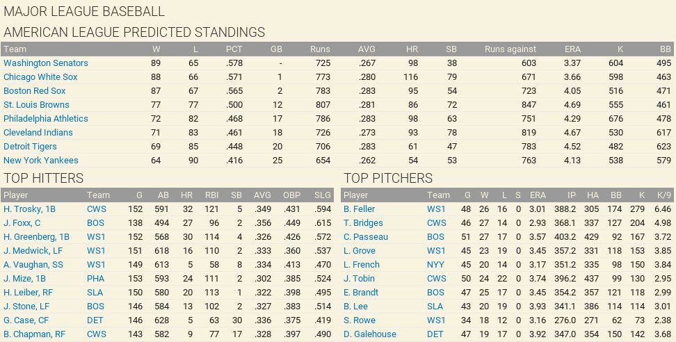 Surprises were in store for the month of June. The Washington Senators were hot all month long. On the other side of the diamond, Philadelphia and Pittsburgh were exchanging barbs while the Giants went down for the count. Cubs' Joe DiMaggio is on a quest to be .400 hitter at the end of the season. The second half of the season is coming up. Standings ![]() Batting Stats ![]() Pitching Stats ![]() Washington Senators Report Record 42-30: 1st place Despite losing Schoolboy Rowe, we had the most productive month of the season so far, 21-9. Bob Feller is named Pitcher of the Month (4-2, 2.12). Major Injuries Schoolboy Rowe (Washington Senators) 10 months torn labrum Ernie Winegard (Philadelphia Athletics) 5 weeks torn labrum Robert Schremser (Detroit Tigers) 5 months torn labrum Gus Dugas (Brooklyn Dodgers) 7 weeks post concussion syndrome Ken Chase (Brooklyn Dodgers) 11 months torn flexor tendon Frankie Kelleher (Chicago White Sox) 3 months broken bone in elbow Hal Trosky (White Sox) Season end severe hip strain