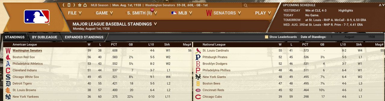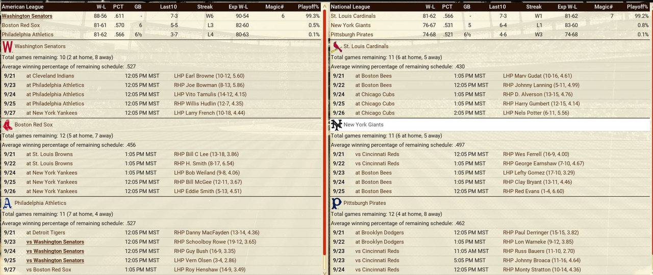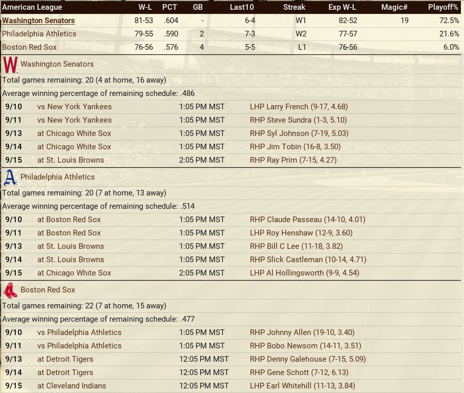 The usual two teams lead the Leagues. Tigers' Chester Wieczorek hit 3 HRs in a single game. The Athletics win 10 in a row. Standings ![]() Batting Stats ![]() Pitching Stats ![]() Washington Senators Report Record 75-49: 1st Place 16-11 in August Bob Feller is a three-peat for Pitcher of the Month (7-0, 2.78 era). Philadelphia gave us a scare as they won 10 straight games top come with a half game.