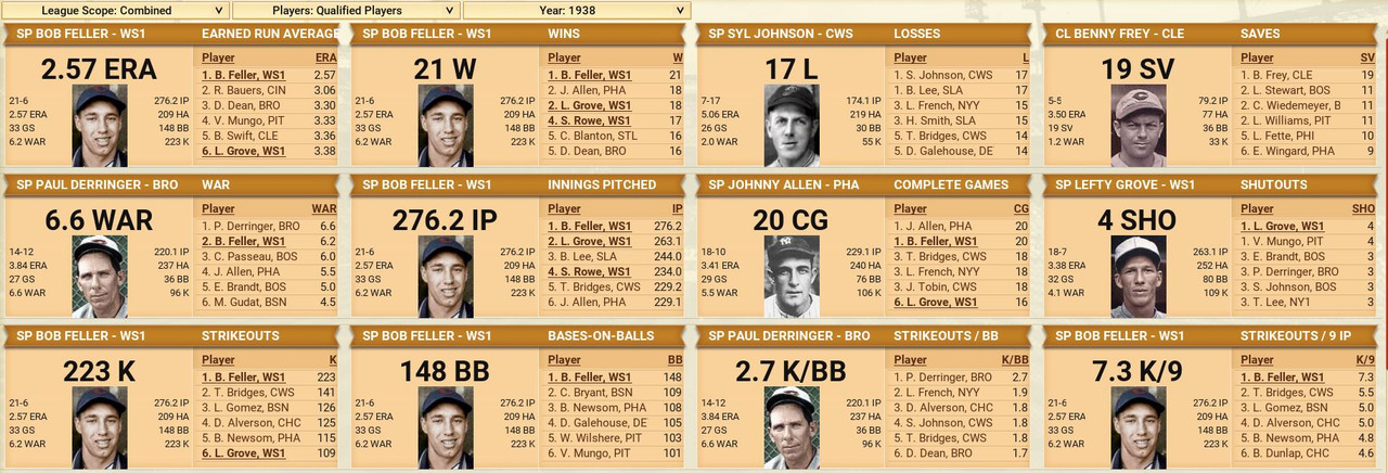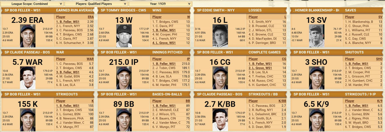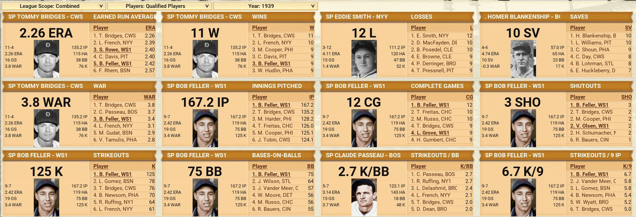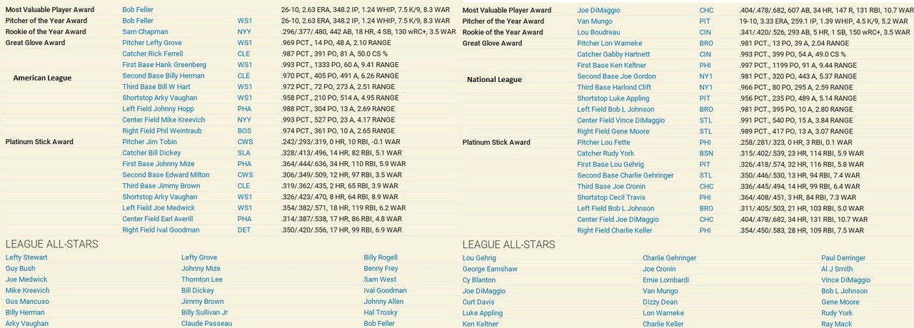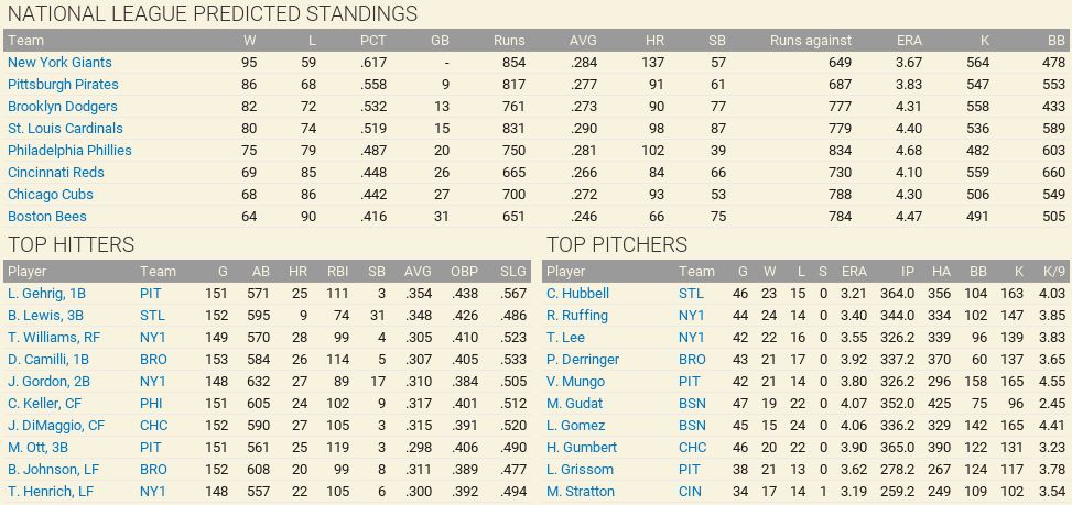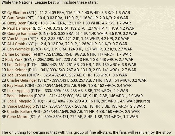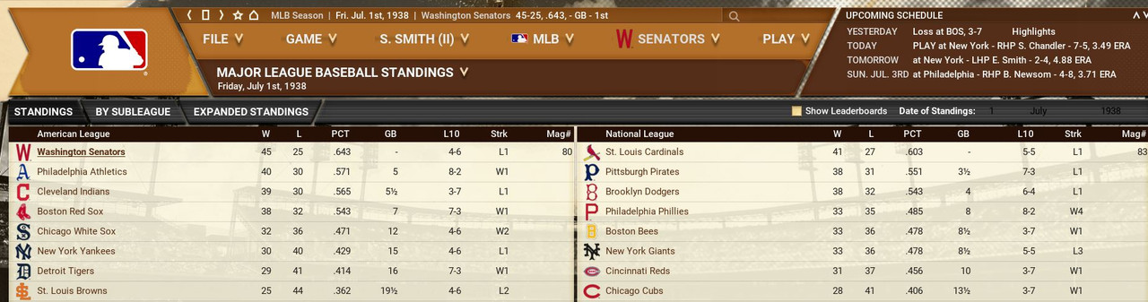 Another month is in the books, with some excitement to go along. The Detroit Tigers won 10 straight games to claim first place in the American League, then went south with 7 of 9 lost. Philadelphia came storming to the top with a 17-12 month of May. The Browns were the top team in June to claim the second place spot. Over in the National League, another Philadelphia team is on top with a slight lead over the New York Giants. Both were chasing each other. Standings ![]() Batting Stats ![]() Pitching Stats ![]() Injuries Schoolboy Rowe (Washington Senators) 12 months torn labrum Ernie Winegard (Philadelphia Athletics) 3 months torn labrum Robert Schremser (Detroit Tigers) 6 months torn labrum Benny Frey (Cleveland Indians) 6 weeks torn UCL Gus Dugas (Brooklyn Dodgers) 3-4 months post concussion syndrome Ken Chase (Brooklyn Dodgers) 12 months torn flexor tendon Frankie Kelleher (Chicago White Sox) 4 months broken bone in elbow Washington Senators Report Record 21-21: 5th Place 5 GB Lost Schoolboy Rowe for the rest of the season. Made two moves. Traded Percy Jones (0-1. 2 saves 6.91 era) to the Philadelphia Phillies for Max Butcher. And Roy Sherid (1-3, 7.53 era) to the Chicago Cubs for Nels Potter. Vern Olsen and William Matheny were purchased from the PCL (San Francisco Seals). Pitching Roster is set at: Bob Feller (5-5, 2.61), Lefty Grove (2-4, 5.06), Vern Olsen (3-1, 3.73), and Nels Potter (0-1. 11.61)
