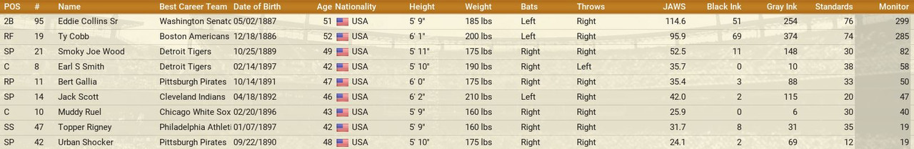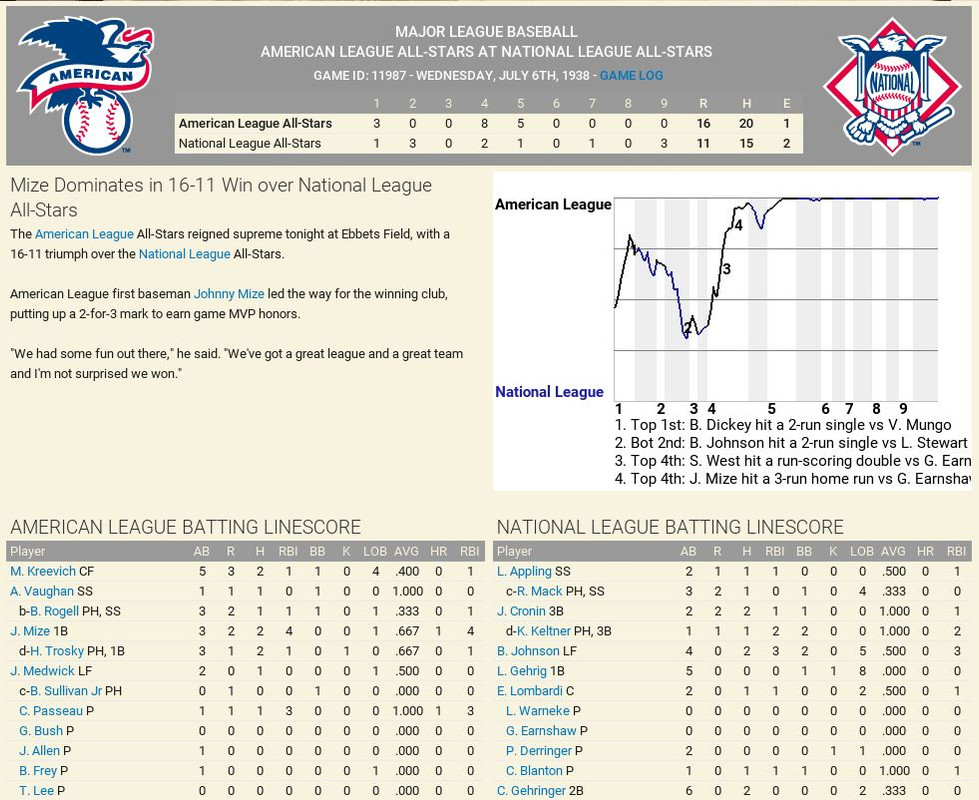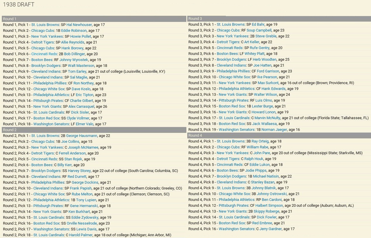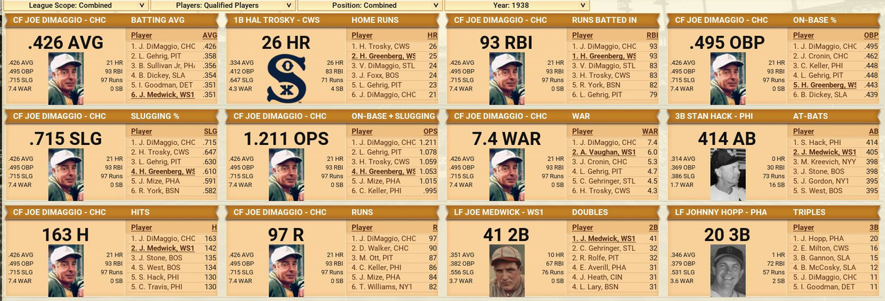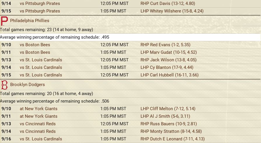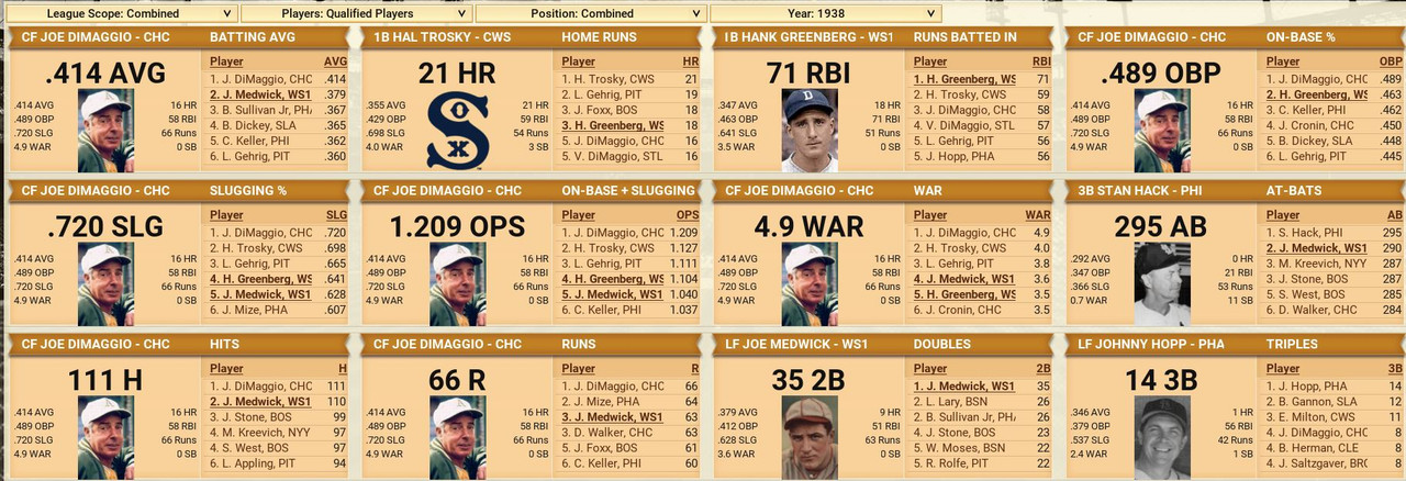 Another month is in the books, with some excitement to go along. The Detroit Tigers won 10 straight games to claim first place in the American League, then went south with 7 of 9 lost. Philadelphia came storming to the top with a 17-12 month of May. The Browns were the top team in June to claim the second place spot. Over in the National League, another Philadelphia team is on top with a slight lead over the New York Giants. Both were chasing each other. Standings ![]() Batting Stats ![]() Pitching Stats ![]() Injuries Schoolboy Rowe (Washington Senators) 12 months torn labrum Ernie Winegard (Philadelphia Athletics) 3 months torn labrum Robert Schremser (Detroit Tigers) 6 months torn labrum Benny Frey (Cleveland Indians) 6 weeks torn UCL Gus Dugas (Brooklyn Dodgers) 3-4 months post concussion syndrome Ken Chase (Brooklyn Dodgers) 12 months torn flexor tendon Frankie Kelleher (Chicago White Sox) 4 months broken bone in elbow Washington Senators Report Record 21-21: 5th Place 5 GB Lost Schoolboy Rowe for the rest of the season. Made two moves. Traded Percy Jones (0-1. 2 saves 6.91 era) to the Philadelphia Phillies for Max Butcher. And Roy Sherid (1-3, 7.53 era) to the Chicago Cubs for Nels Potter. Vern Olsen and William Matheny were purchased from the PCL (San Francisco Seals). Pitching Roster is set at: Bob Feller (5-5, 2.61), Lefty Grove (2-4, 5.06), Vern Olsen (3-1, 3.73), and Nels Potter (0-1. 11.61)