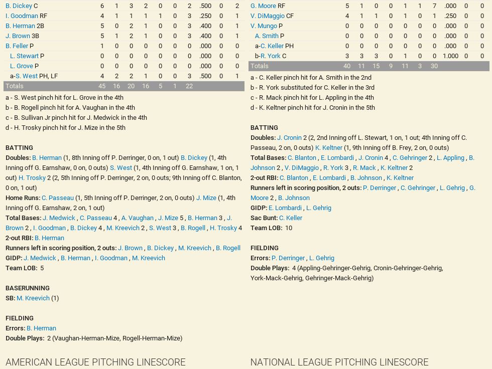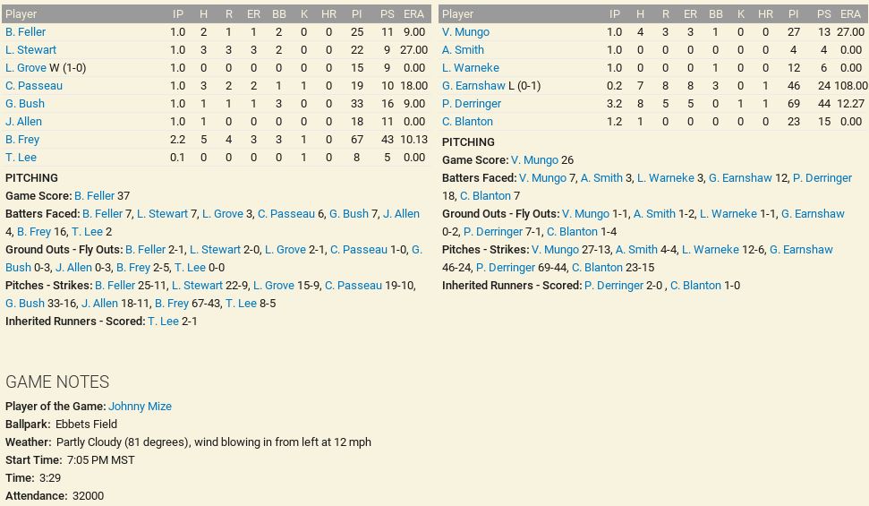 Game 1 St Louis at Washington Carl Hubbell (17-13, 3.85) vs Schoolboy Rowe (19-13, 3.85) Mickey Cochrane's 2 RBI single lifts Cardinals 6-3. Schoolboy Rowe is injured (mild shoulder inflammation). Game 2 St Louis at Washington Jack Wilson (16-8, 3.81) vs Guy Bush (17-10-3.48) Arky Vaughan goes 2-3, with a HR and 3 RBIs. Wilson walks 8 Senators.Rookie Woody Rich picks up his first career win, Washington 12-7 over Cardinals. Game 3 Washington at St Louis Bob Feller (26-10, 2.63) vs Freddie Fitzsimmons (15-13, 4.23) Fitzsimmons out duels Feller 2-1 Game 4 Washington at St Louis Vern Olsen (4-4, 3.33) vs Cy Blanton (21-9, 4.02) Rookie pitcher Woody Rich hits a 3 run home run to tie but will lose in the bottom of the 8th, 9-6. Bob Elliot hits a go ahead RBI single. Game 5 Washington at St Louis Bob Feller (0-1, 2.25) vs Carl Hubbell (1-0, 3.00) Cards down Senators 5-1.