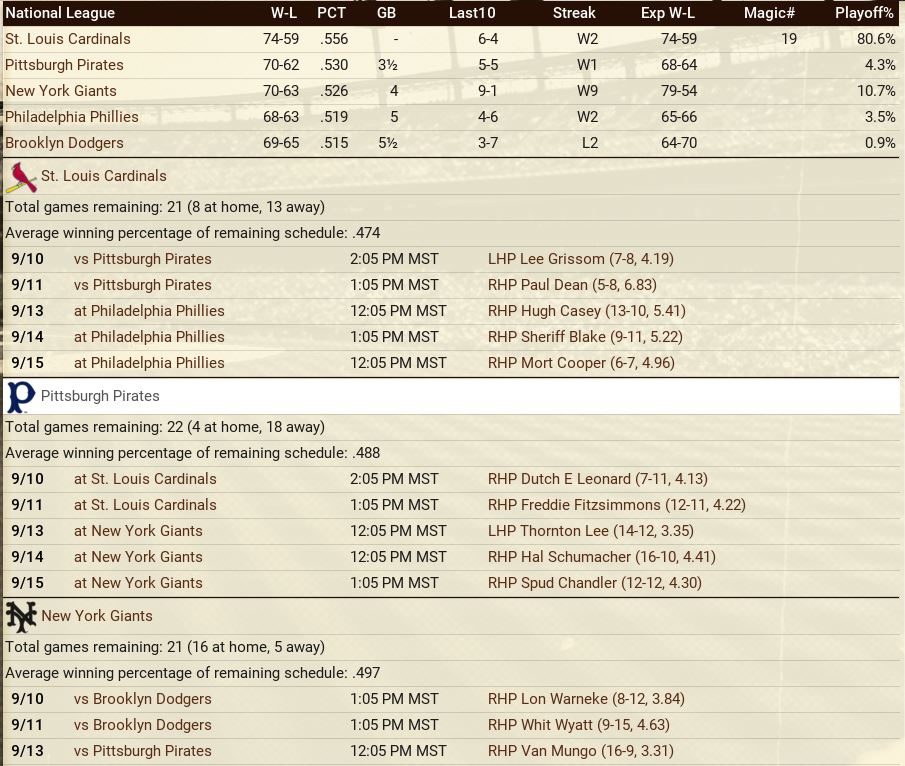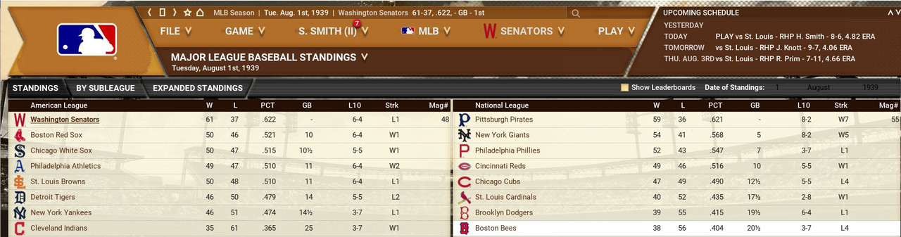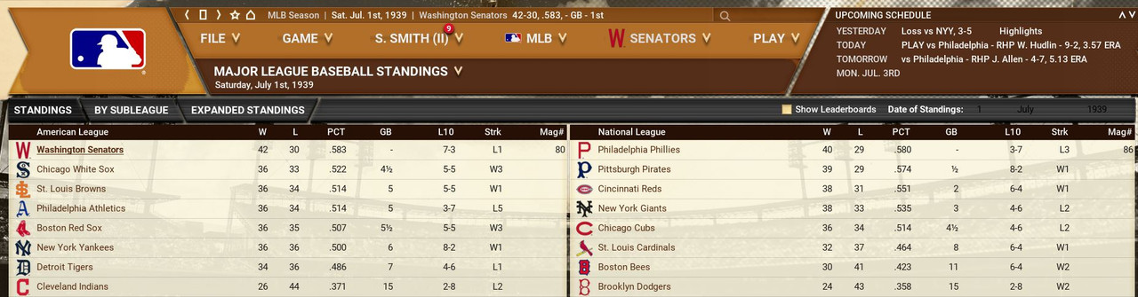 In the National League, the Pirates shot to the top thanks to a current 7 game winning streak. But the New York Giants are in the ball park so to speak with their 5 game streak. The American League sees the Washington Senators on a comfortable 10 game lead over the Boston Red Sox. Senators' Bob Feller is riding a personal 8 game winning streak and a 12 game undefeated streak Standings ![]() Batting Stats ![]() Pitching Stats ![]() Major Injuries Schoolboy Rowe (Washington Senators) 9 months torn labrum Ernie Winegard (Philadelphia Athletics) 11 months torn labrum Robert Schremser (Detroit Tigers) 4 months torn labrum Gus Dugas (Brooklyn Dodgers) 3 weeks post concussion syndrome Ken Chase (Brooklyn Dodgers) 10 months torn flexor tendon Frankie Kelleher (Chicago White Sox) 7 weeks broken bone in elbow Hal Trosky (White Sox) Season end severe hip strain Washington Senators Report Record 61-37: 1st Place American League We lead the Al by 10 games over the Red Sox. Additions Nels Potter (8-3, 3.61) and Max Butcher (1-1, 1.96, 4 sv) are paying off