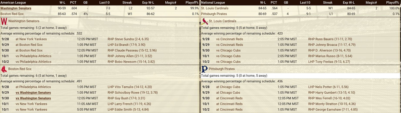 American League Pennant Senators lose ace Lefty Grove for the rest of the year with a herniated back disc, ![]() National League Pennant New York Giants enter the picture with 9 consecutive wins. ![]()