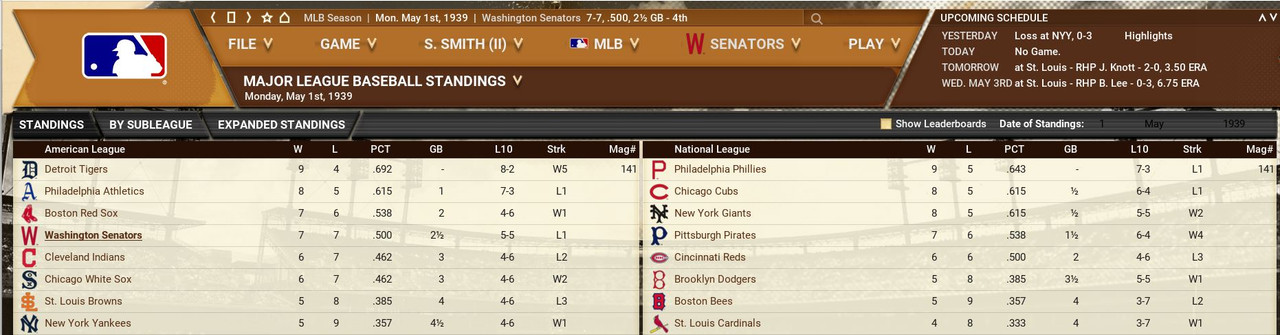 The St Louis Cardinals are trying to distance themselves from the rest in the National League. Cleveland is trying to stay in the hunt in the American League. Joe DiMaggio (Chicago Cubs) is hitting .430. Johnny Mize (Philadelphia Athletics) is leading the Home Run race with 13. Standings ![]() Batting Stats ![]() Pitching Stats ![]() Washington Senators Report Record 29-14: 1st Place Lefty Grove (6-0, 3.18 in May) and Hank Greenberg (.345, 9 HR, 37 RBIs) are named Pitcher and Batter of the Month. 20-11 during the month help us to stay on the top of the American League. Joe Medwick is in the top 8 in batting average.