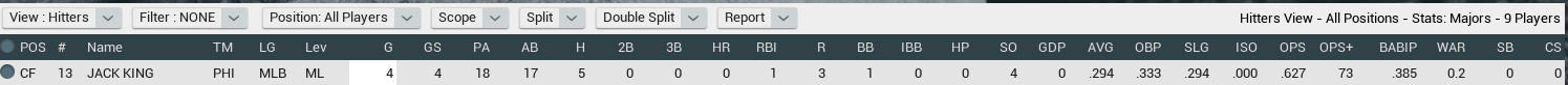 Notes: King and Keeran struggle a little, but still put up respectable numbers for their age. I expect they will both have a full season in the bigs next year. Not a lot of movement form the other guys, mostly Rookie to High A ball. I expect they will all be in AA or higher next season. Playoffs to sim next, then I will run it to Spring 2018. |