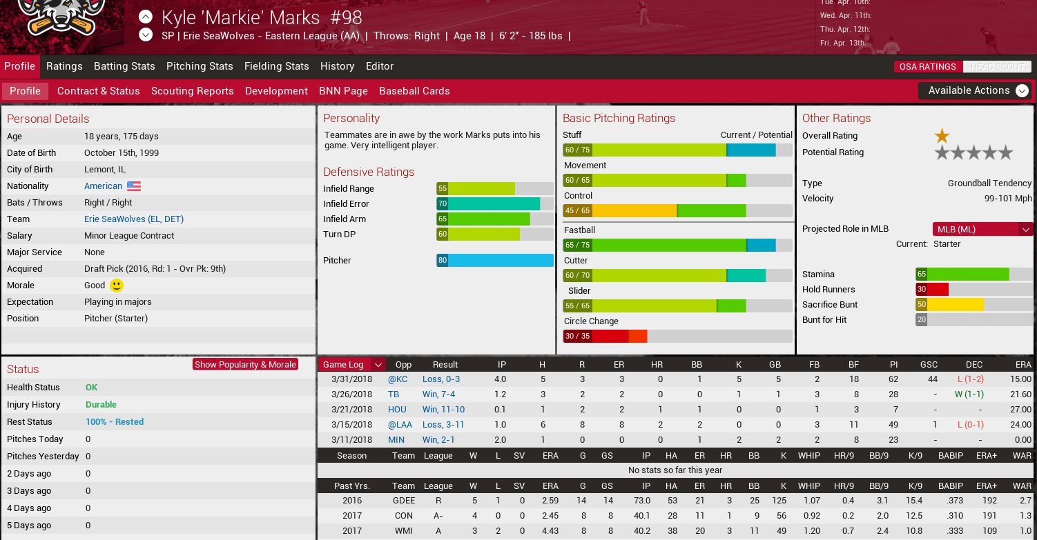 Prospects on 3/4/18...the CPU went nuts and called everyone except Snyder and Seyde up to the bigs for spring training.