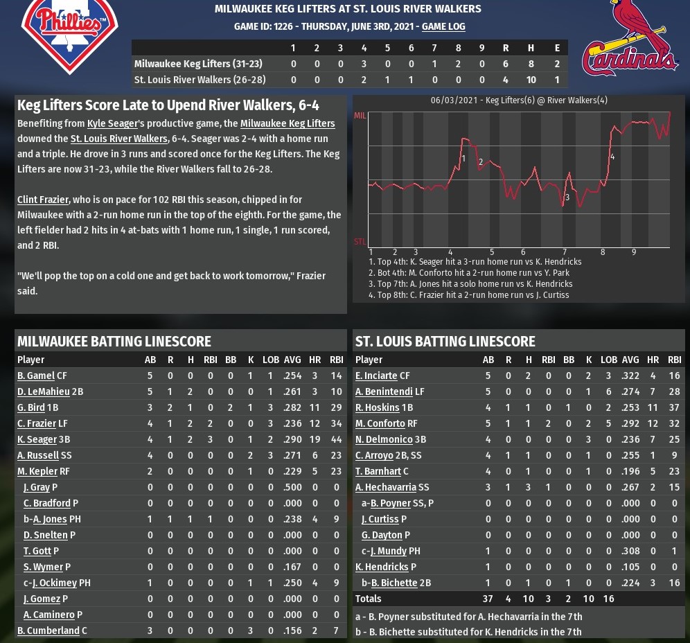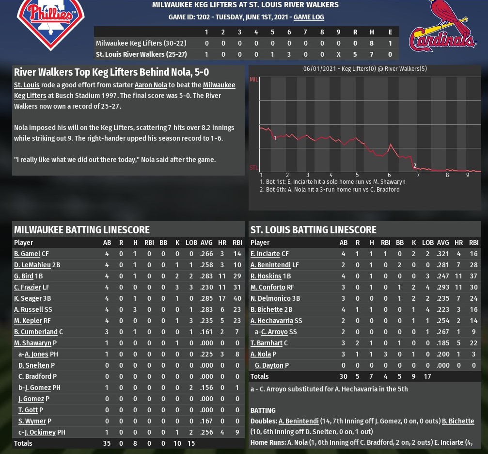 Clint Frazier hit a two-run home run off St. Louis reliever John Curtiss in the top of the eighth inning to snap a tie and help give Milwaukee a 6-4 win at Busch Stadium (1997). With the win, the Keg Lifters split the four-game series with the River Walkers. Greg Bird had hit a one-out double off Bobby Poyner just before Curtiss entered the game to face Frazier. Down 4-3, Milwaukee had tied the game in the top of the seventh when pinch-hitter Adam Jones led off with a homer off Walkers starting pitcher Kyle Hendricks. A three-run homer from Kyle Seager in the fourth inning off Hendricks had staked the Lifters to a 3-0 lead. But St. Louis rallied starting with a pair of runs in the bottom of the fourth on a two-run homer from Michael Conforto off Milwaukee starter Yeo-san Park. A passed ball led to Adeiny Hechavarria scoring a run in the fifth to tie it at 3. Hechavarria had an RBI single in the sixth to put the Walkers in front 4-3. Park went just 3.2 innings for the Lifters, allowing two runs on four hits. Seven relievers followed him to the mound. Josiah Gray worked the hardest going 2.1 innings. Sean Wymer recorded the final two outs of the seventh and earned his fourth win. Arquimedes Caminero allowed St. Louis to load the bases in the ninth, but he got Conforto to ground out to end it. The save was his 17th of the season.  |