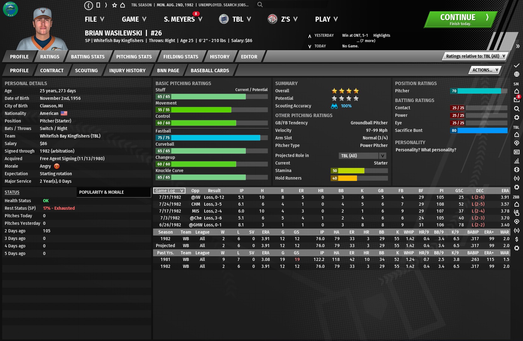 https://forums.ootpdevelopments.com/...=313427&page=4 (3rd post down from the top) How has he done since that impressive streak? He cooled off a bit in 1982 but returned on a mission in 1983 and won the league Win and ERA titles.