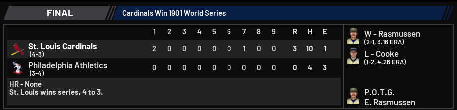 Like two battle-scarred prizefighters, Cooke and Rasmussen stepped back into the ring for the decider. And, oh what a show they put on. The Cards went ahead with 2 in the top 1st, with 2 key errors meaning both were unearned, shifting all of the pressure onto the home team. And from there, Rasmussen took charge, never letting the A’s hitters get anything going as he gave up just 4 hits (and not more than one in an inning) in a remarkable performance that will earn him instant cult hero status. Another unearned run in the 7th put St Louis out by 3, and the A’s bats stayed quiet for the remainder as the Cards capped a stunning comeback in the finest style possible. Cooke did all he could, pitching a complete game, but it wasn’t to be as the Cards were triumphant in a classic inaugural FL World Series. Cards 3B JP Crawford was named MVP for his .478 / 3 RBI effort. |