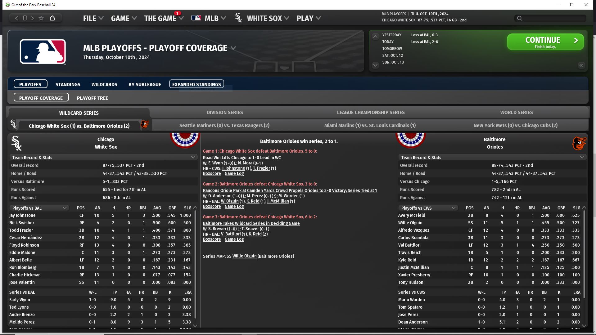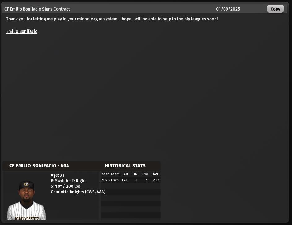 Although we faded at the end, we had a good season overall. We went 1-2 in the playoffs. Many things to look forward to in 2025, although some changes need to be made. I am looking at bringing in a top prospect 1b, a veteran DH, 2 relief pitchers, 1 from each side and a few top prospects. No upcoming FA's will return in 2025.