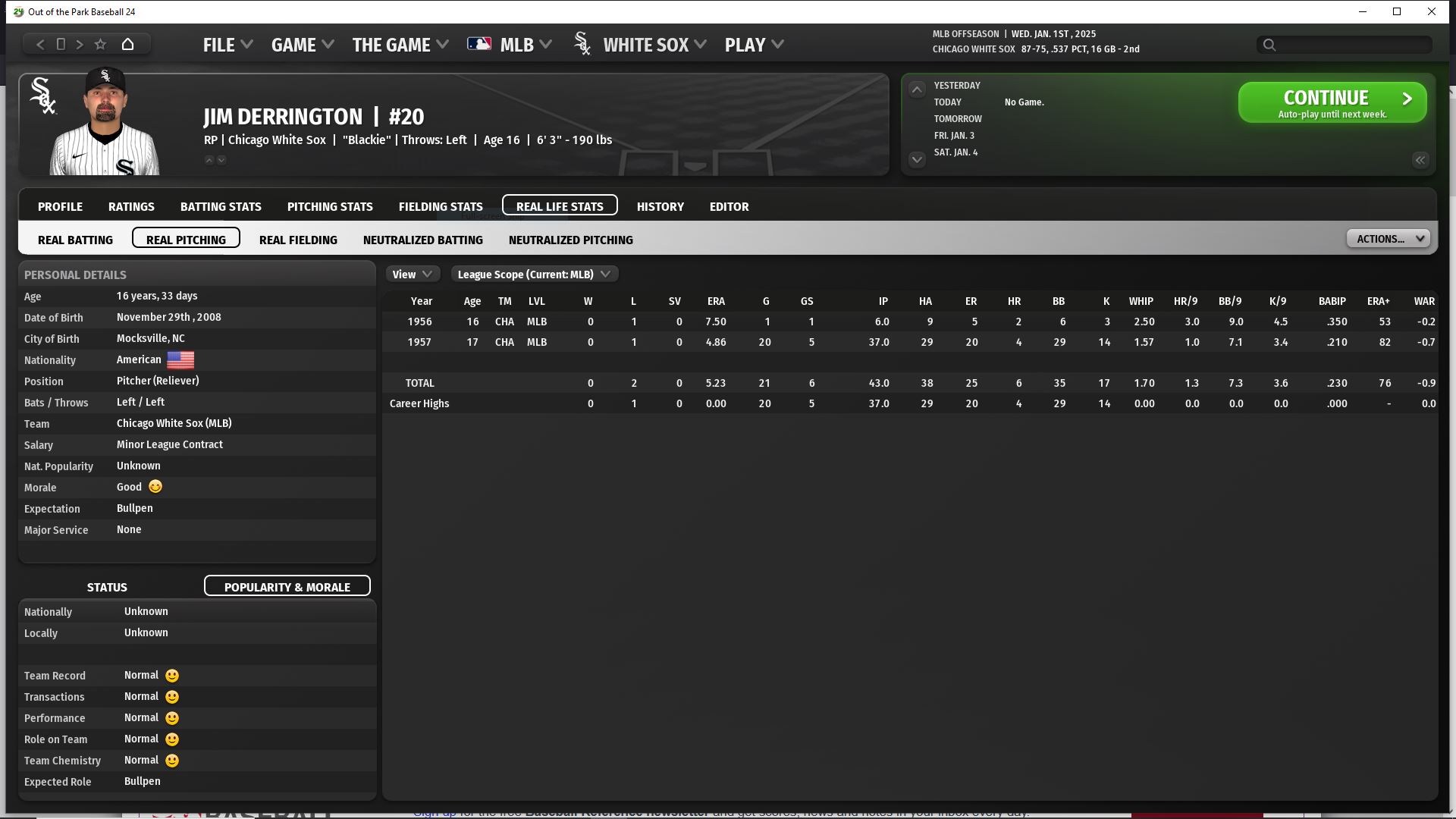 I have taken control of certain aspects of the lineup and pen. I told MGR Terry Bevington to hit Bonura 2nd, Belle 3rd & Thome 4th. Also for Wilhelm to stay as the CL. Also he wanted to bench Frazier vs RHP. We do have a good amount of $$ available for extensions. Several of the players in waiting, are more for 2027 vs 2026, so I might look at re-signing several players for 1-2 yrs. I might fail at all of JR's goals this year.