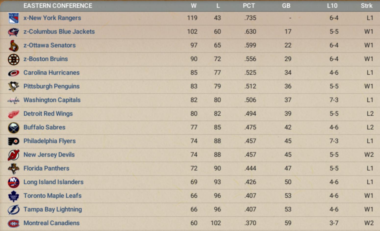 East #4 Boston Bruins vs. #1 New York Rangers BOS 5 @ NYR 2 (10) BOS 8 @ NYR 1 NYR 2 @ BOS 3 (10) NYR 5 @ BOS 7 Bruins win series 4-0 #3 Ottawa Senators vs. #2 Columbus Blue Jackets OTT 14 @ CLB 4 OTT 3 @ CLB 5 CLB 6 @ OTT 2 OTT 12 @ CLB 6 OTT 3 @ CLB 4 (12) CLB 7 @ OTT 1 Blue Jackets win series 4-2 West #4 Winnipeg Jets vs. #1 Colorado Avalanche WIN 11 @ COL 12 WIN 6 @ COL 3 COL 2 @ WIN 1 COL 11 @ WIN 0 WIN 2 @ COL 3 Avalanche win series 4-1 #3 Los Angeles Kings vs. #2 San Jose Sharks LAK 8 @ SJ 4 LAK 2 @ SJ 3 SJ 7 @ LAK 6 SJ 13 @ LAK 6 LAK 0 @ SJ 8 Sharks win series 4-1 Last edited by jg2977; 07-16-2024 at 07:46 AM. |