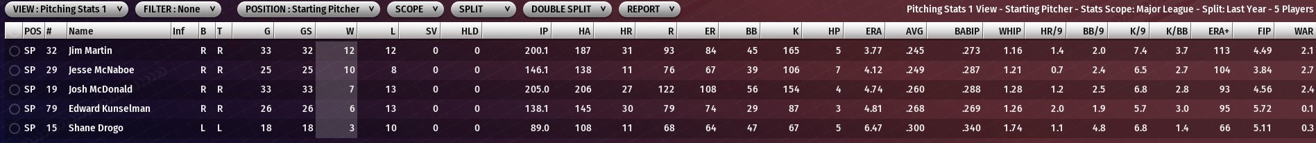The right-hander went 10-9 with a 4.12 ERA in the 25 starts he did make. McNaboe owns a career record of 53-35. No. 2 -- Jim Martin - The right-hander enjoyed a good first season with the River Walkers. Not only did he earn the starting nod for the National League in the All-Star game, but the 30-year-old went 12-12 with a 3.77 ERA in 33 games (32 starts). Martin owns a career-record of 51-61. No. 3 -- Josh McDonald -- Acquired in an off-season trade with Ann Arbor, the 28-year old McDonald is coming off a season where he went 7-13 with a 4.74 ERA for the Wolf Pack. McDonald owns a career record of 41-53. St. Louis gave up right-handed reliever Justin O'Rourke and right-handed pitching prospect Alejando Chacon in the trade to get McDonald. No. 4 -- Edward Kunselman -- The 31-year-old right-hander was acquired in a trade from Toledo. The 2034 season was his first as a full-time starter for the Mud Hens, he went 6-13 with a 4.81 ERA in 26 games. For his career, Kunselman is 29-27 with two saves and 4.44 ERA in 219 games (52 starts). St. Louis gave up minor-league pitching prospect Josh Rochford to get Kunselman. No. 5 -- Shane Drogo -- Acquired from Peoria prior to the 2034 season, Drogo's first season in St . Louis was a disappointment. The 29-year-old left-hander went 3-10 in 18 starts, he was injured twice, with a 6.47 ERA. For his career, Drogo is 69-71 with a 3.98 ERA in 219 games (204 starts). |