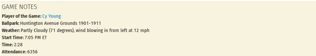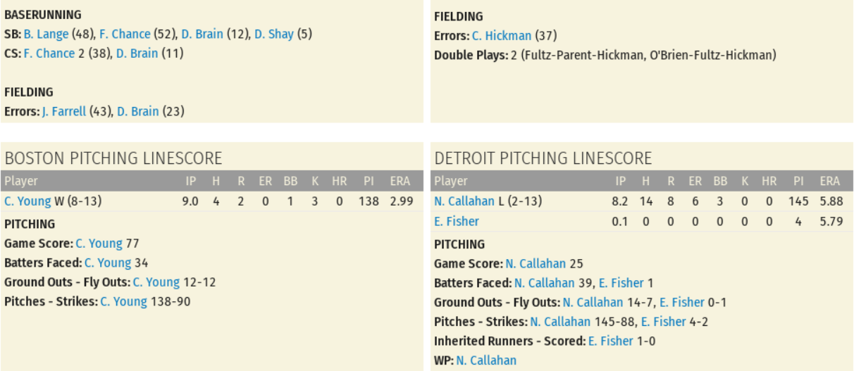 Cy Young (8-13) pitched a fine game, allowing 2 unearned runs on just 4 hits and 1 walk; Game Score 77. Nixey Callahan (2-13) continued his struggles as he gave up 8 runs (6 earned) on 14 hits, 3 walks, and 1 wild pitch in 8 2/3 innings of play; Game Score 25. Ed Fisher covered the final 1/3 inning of scoreless ball. The hitting-attack was working well today for the Americans, as Fred Clarke (3 for 5, Double, Run, 3 RBIs), Chick Stahl (1 for 2, Double, Run, 2 Walks), and Frank Chance (3 for 5, 2 Runs, RBI, Stolen Base). Roger Bresnahan (2 for 4, RBI, Stolen Base) and Freddy Parent (1 for 2, Run, RBI, Stolen Base) played well in the loss. Player of the Game: Cy Young (Season: #7 / Career: #39)