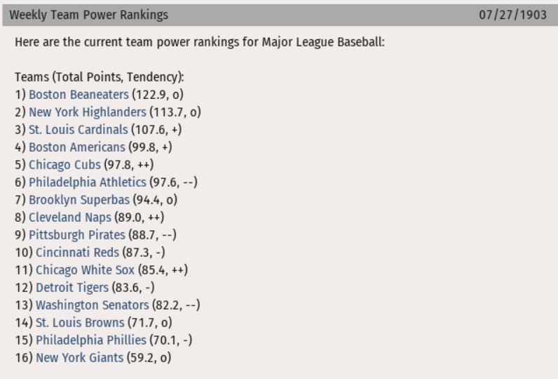 The latest Power Rankings have the Boston Beaneaters (60-46) in the top spot, followed by the New York Highlanders (64-42) and the St. Louis Cardinals (61-45). The Boston Americans (57-49) have moved up to a season-high 4th place, and the New York Giants (39-67) have a solid hold on the last spot.