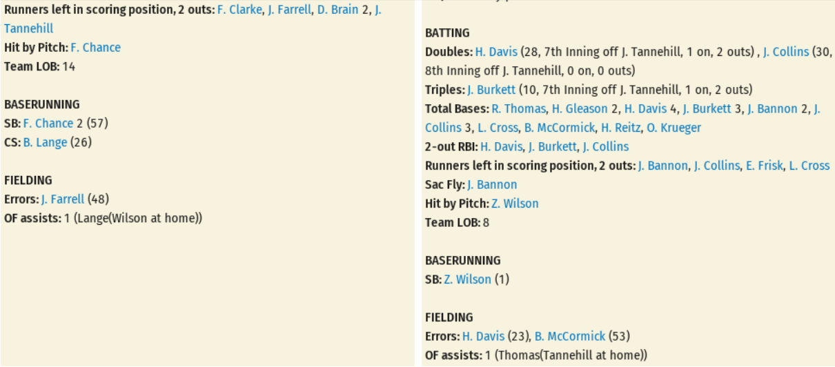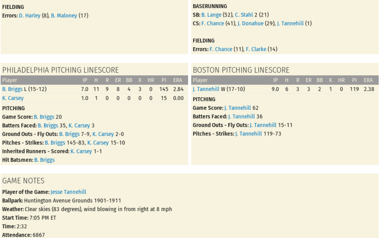 The game went well for the Americans (60-51), as they topped the 2nd-place Athletics (62-49) by a score of 9 to 3 behind the solid pitching of Jesse Tannehill. The win keeps Boston in 3rd place in the American League standings; 5 games out of the top spot. The reliable Jesse Tannehill (17-10) came through today, permitting 3 earned runs on 6 hits and 2 walks; Game Score 62. Buttons Briggs (15-12) was tagged with the loss after allowing 9 runs (8 earned) on 11 hits, 4 walks, and 1 hit batsman in 7 innings of play; Game Score 20. Kid Carsey covered the final inning in a scoreless outing. There were several fine hitting performances by the Americans, led by Jiggs Donahue (2 for 3, Triple, 3 RBIs), Danny Shay (2 for 3, 2 Runs, RBI, Walk, 2 Stolen Bases), Fred Clarke (2 for 4, Double, Run, 2 RBIs), Chick Stahl (2 for 3, 2 Runs, Walk), and Bill Lange (2 for 5, 2 Runs, RBI, Stolen Base). Tom McCreery (1 for 3, Run, Walk, Stolen Base) and Honus Wagner (2 for 3, Run, RBI, Walk, Stolen Base) played well in the loss. Of Note, since taking over shortstop duties from Kid Elberfeld on July 17th, Danny Shay is batting .439 (18 for 41) with 3 Doubles, 1 Triple, 9 Runs, 3 RBIs, 5 Walks, and 4 Stolen Bases, and has seen his slash rise from .303/.352/.364 to .365/.416/.452; on pace for 2.0+ WAR. Player of the Game: Jesse Tannehill (Season: #17 / Career: #57)