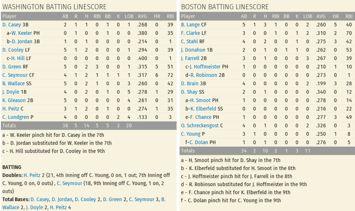 Carl Lundgren (7-8) earned the win in which he permitted 2 runs (1 earned) on 10 hits and 1 walk; Game Score 63. Cy Young (9-14) was tagged with the loss after allowing 5 earned runs on 14 hits, 5 walks, and 1 wild pitch; Game Score 37. The Senators frequently put the ball in play today, led by Danny Green (2 for 5, 3 RBIs, Stolen Base), Heinie Peitz (2 for 3, 2 Doubles, Run, Walk), and Cy Seymour (2 for 4, Double, Run, RBI, Walk). The Americans offense was powered by Bill Lange (3 for 5, Triple, Run, RBI) and Chick Stahl (2 for 4, Stolen Base). Player of the Game: Carl Lundgren