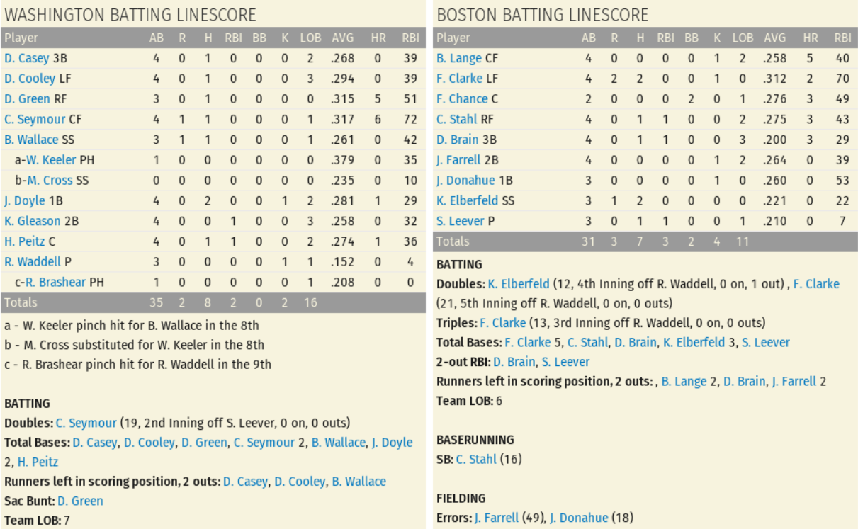 ![]() Picking up the win was Doc Scanlan (16-12) after he limited the opposition to 3 runs (2 earned) on 10 hits and 4 walks while striking out 5; Game Score 58. Noodles Hahn (14-11) got the start for Boston and lasted 7 1/3 innings of play in which he allowed 7 runs (2 earned) on 8 hits and 1 walk; Game Score 50. John Gilroy covered 2/3 innings in a scoreless effort before turning the ball over to Jose Ramos for 1 inning in which he allowed 4 hits and 2 unearned runs. The Senators offense was led by Cy Seymour (2 for 5, Triple, Run, RBI), Kid Gleason (2 for 5, 2 RBIs), Heinie Peitz (2 for 5, 2 Runs, RBI), and Bobby Wallace (1 for 5, 3 Runs). Danny Shay (3 for 4, Double, Run, Stolen Base), Chick Stahl (3 for 5, 3 Stolen Bases), and Bill Lange (2 for 3, Double, RBI) hit the ball well in the loss. Player of the Game: Doc Scanlon