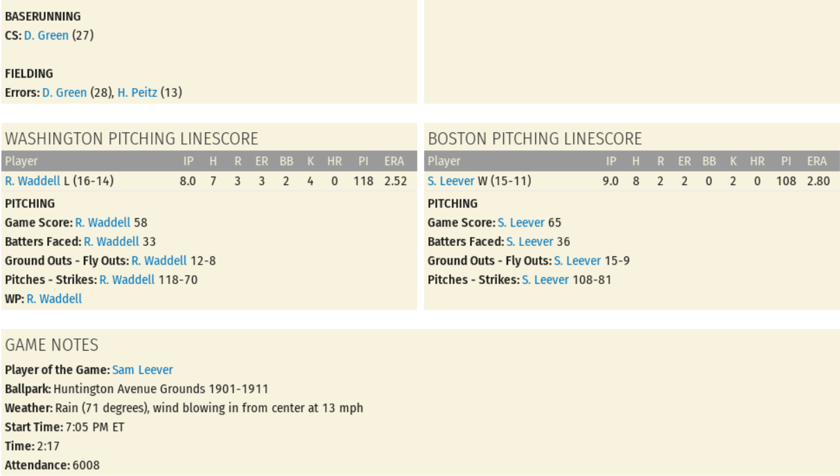 Another squandered opportunity that greatly disappointed the 5,707 hometown fans who attended the game. Here, the Washington Senators (51-57) beat the Boston Americans (58-50) by a score of 5 to 2. The loss now has the team sitting 7 games back; Magic #30.