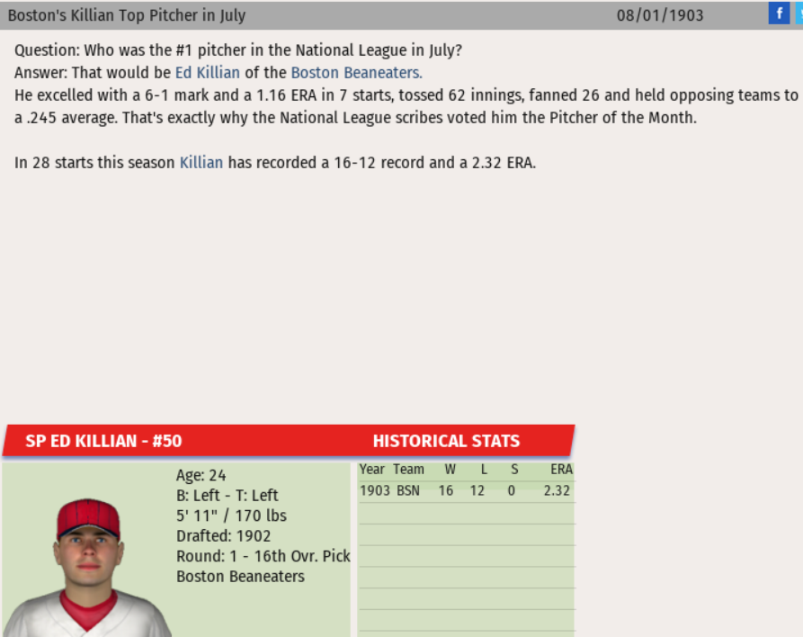 It was a special month for Boston Beaneaters rookie pitcher Ed Killian. The former 1st round (16th overall selection) not only took home National League Rookie of the Month honors, he was also named the National League Pitcher of the Month. In picking up the honors, Killian posted a 6-1 record with a 1.16 ERA and 26 strikeouts in 62.0 innings of play. His efforts generated 0.9 WAR and 1.0 WPA on the month.