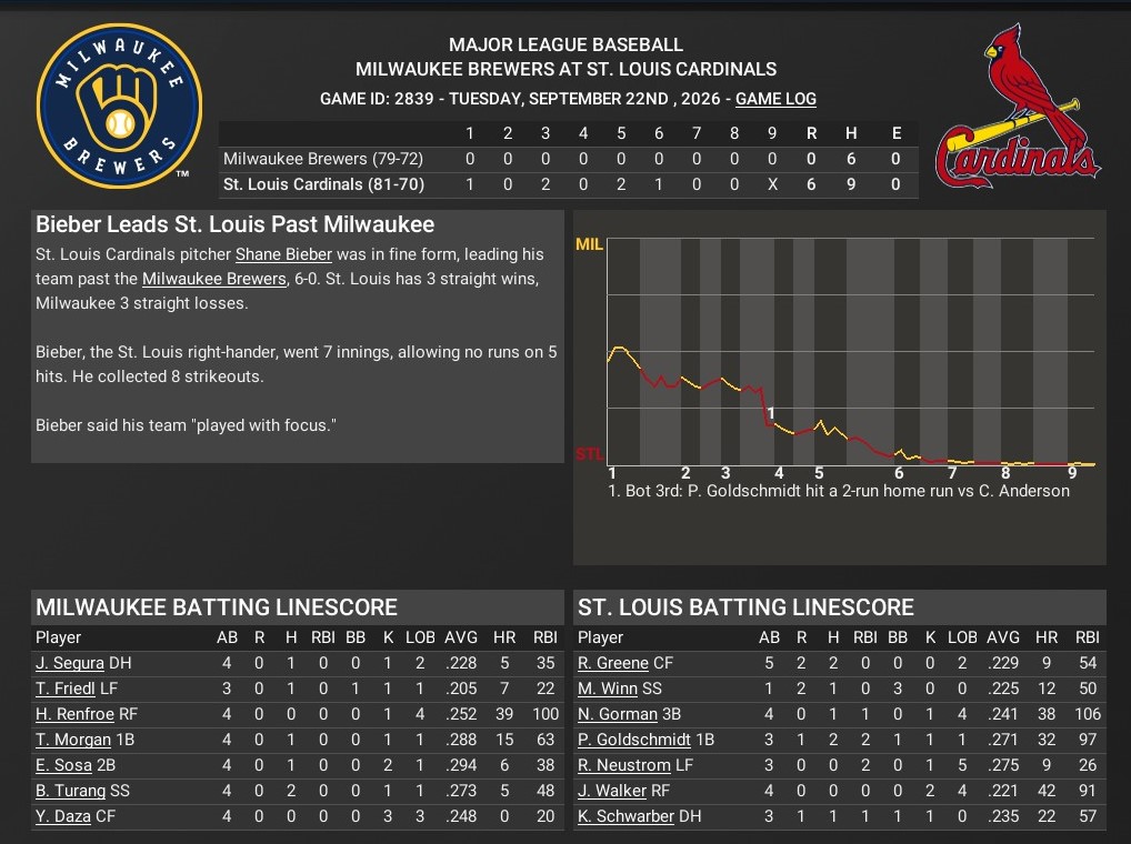 Cards news: Sept. 22 -- St. Louis Cardinals 6, Milwaukee Brewers 0