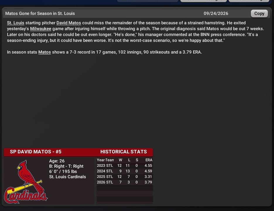 The St. Louis Cardinals have lost right-handed starting pitcher David Matos for the remainder of the season after he suffered a straining hamstring during the first inning of an 1-0 loss to the Milwaukee Brewers on Sept. 24.