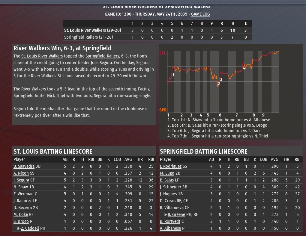 Down 5-4, St. Louis scored a pair of runs in the bottom of the sixth inning, and then added two more runs in the seventh, as the River Walkers downed Kansas City 8-5 at Busch Stadium (2006). Getting a lead-off home run from Rafael Devers (off St. Louis starting pitcher Edward Kunselman) and RBI single from pinch-hitter Zachary Landis (off reliever Scott Rissler, the Monarchs had taken a 5-4 lead in the top of the sixth. The Walkers seized the lead right back against the KC bullpen, all off the scoring coming with two outs. Jose Segura drew a lead-off walk and Nick Shaw followed with a single. Patricio retired the next two, but rookie Manuel Coke singled to score Segura and tie the game. Daniel Becerra then drew a walk to load the bases. Fresh off a quick trip to the minors, it was to make room for Alex Pazos to make an emergency start, Nathaniel Dixon delivered a pinch-hit single to put the Walkers back in front. St. Louis added two more runs in the sixth -- when it opened the inning with three consecutive singles off Monarchs reliever Chris Long. The third single, by Nick Shaw, scored Aaron Nixon, who had led off the inning. Zach Wenman later scored Jose Segura with a two-out single. Shaw was injured while running the bases during the sequence. He is only expected to have to sit for a couple of games. St. Louis starting pitcher Eric Kunselman worked into the fifth inning, allowing five runs on five hits. He struck out five and walked two. Rissler finished the sixth and was on the mound when the Monarchs took the lead. However, Rissler (3-1) was still the pitcher of record when the Walkers reclaimed the lead, allowing him to earn the win. Greg Sones, Zachary Stella and Nick Strother all pitched scoreless innings to end the game. Strother increased his save total to 11. |