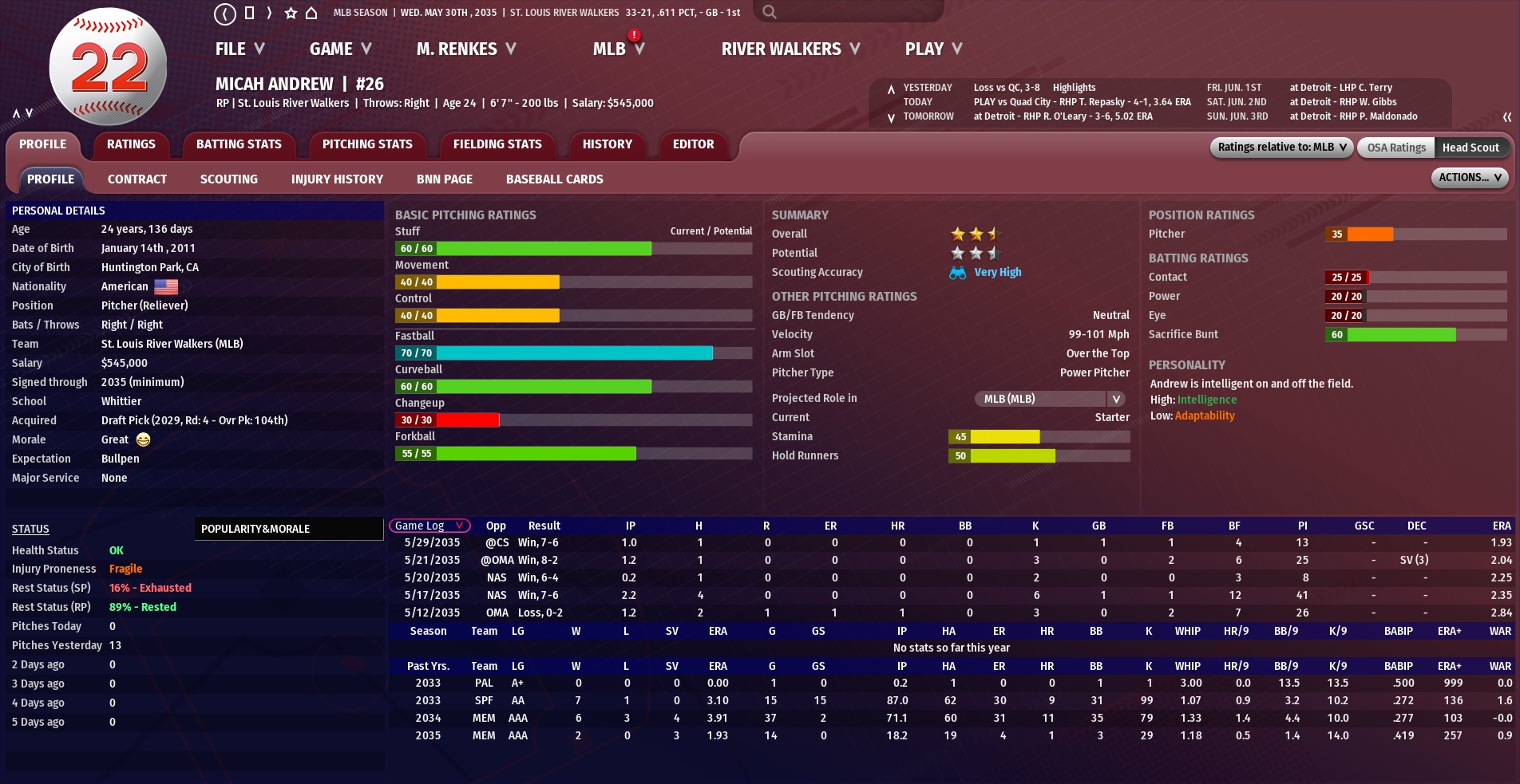 Martinez, 31, last pitched in the Walkers' 8-3 loss to Quad City on May 29. During the 2035 season, Martinez has pitched in 19 games, going 1-1 with a 4.41 ERA. He is expected to miss two weeks. Getting the callup from AAA Memphis, and making his first venture in the majors, is 24-year-old right-handed pitcher Micah Andrew. Andrew, a fourth-round pick in the 2029 draft, has pitched in 14 games for the Redbirds going 2-0 with three saves and a 1.93 ERA. |