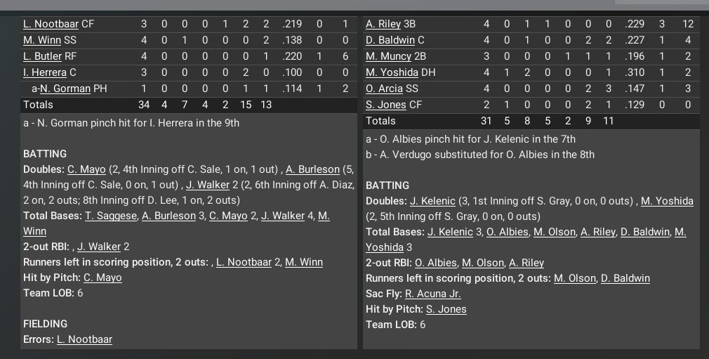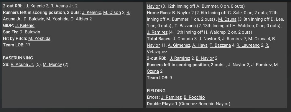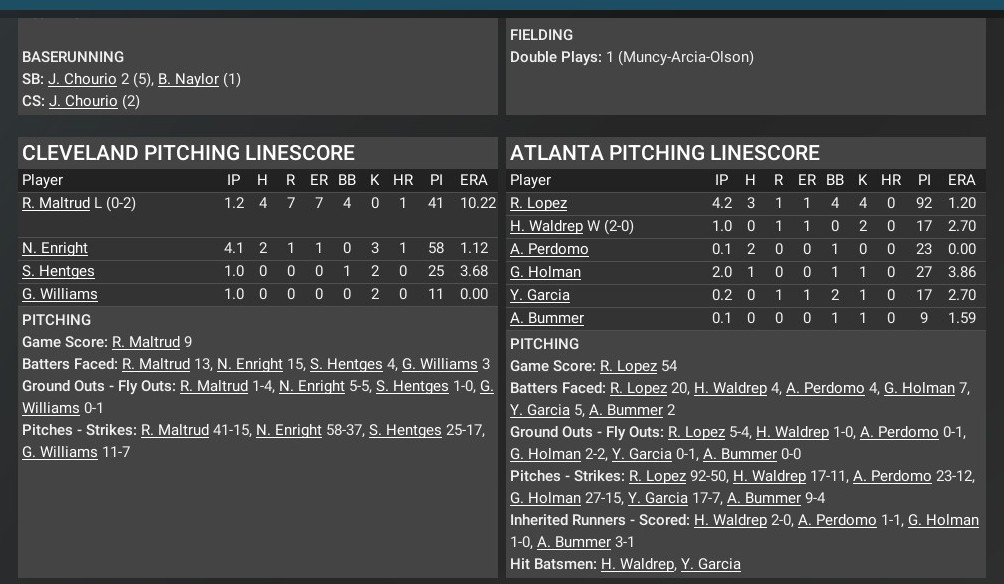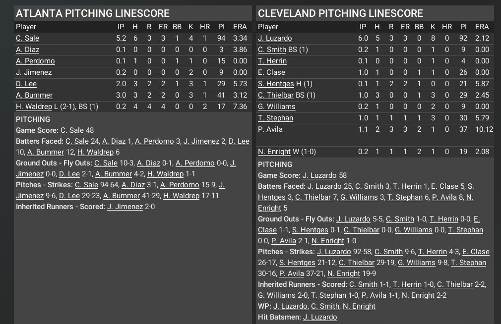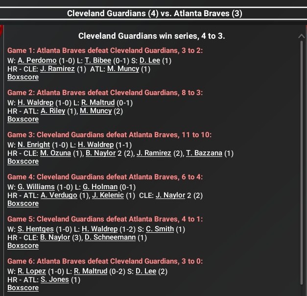 MLB news: Nov. 5 -- World Series - Cleveland Indians def. Atlanta Braves, 4-3 (Team statistics)