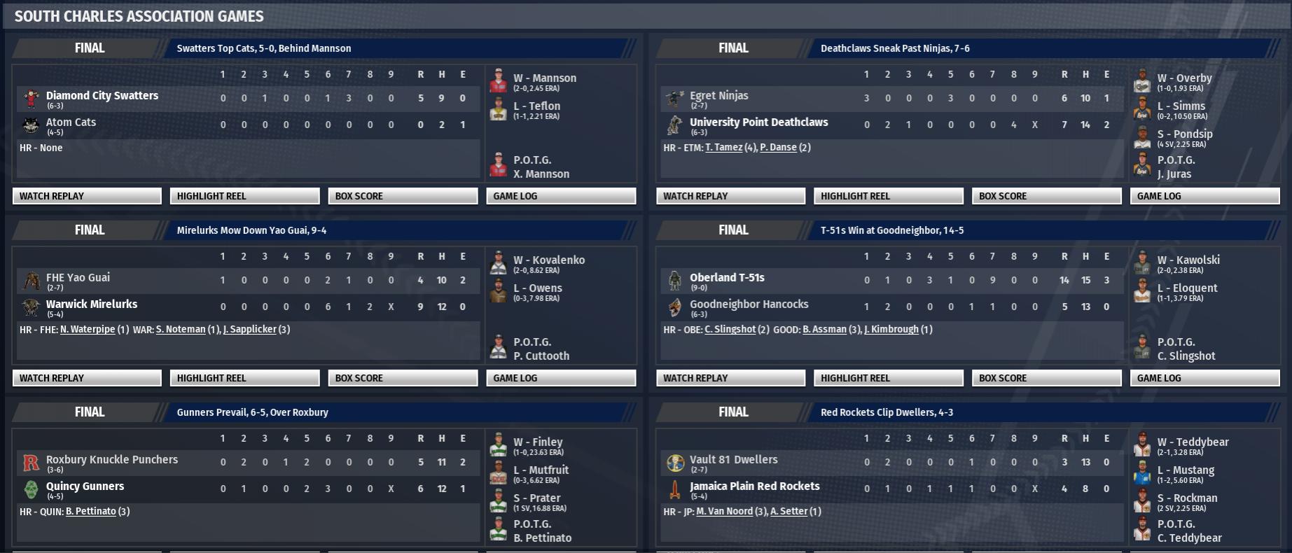 Today in the CBO News and Notes - Reports from around the Commonwealth by Nat Wright-Kowalski 18 April 2298 - Tykeson Has Historical Day in BMU Game Taffington Boathouse Spy Hunters first baseman Lannie Tykeson almost did it all today. He sent three shots out of the ballpark, scored 3 times and drove in 8 runs and had 5 hits in 5 at-bats. The one thing he could not do, however, was lead the Spy Hunters to victory. The Outpost Zimonja Strongbacks escaped with the 15-11 win by the Outpost Zimonja despite being on the receiving end of the barrage from Tykeson. "I'd be lying if I said I didn't like hitting three homers, but losing takes a little glitter off the game," he admitted to BNN writers after the game. Lannie Tykeson hit a three-run home run off Bobby DeLaune in the 1st, hit a two-run home run off Bobby DeLaune in the 3rd, singled in the 5th, singled in the 8th and hit a three-run home run off Troy Kisspeople in the 9th. "When someone hits three home runs, you put yourself in a tough position to win," said Taffington Boathouse manager Tim Haysneedle. "We were lucky to win this one. I don't think it matters how hard you throw, especially in the Commonwealth Association. If you leave a ball out over the plate to good Boston Minor Union hitters, if they get a bead on you and you leave it over the middle, they're probably going to take a good hack at it." To date this year Tykeson is batting .480 with 3 home runs. "Tykeson was really good, we were just a little better," said Strongbacks manager David Troutman in the postgame interview. "It's all right with me if he gets 5 hits every game against us, as long as we win." 19 April 2298 - Tiller Hits 2 home Runs in Shroud Win in Heavyweight Battle The Fort Hagen Silver Shroud downed the Easy Town Assaultrons, 7-3, at Hubris Comics Park. The Silver Shroud were led by Jim Tiller. He went 4 for 4 with 2 home runs and 2 singles, while scoring 3 runs and driving in 4. Brent Hooker, the winner, improved to 2-1. He held the Assaultrons to 2 runs on 6 hits over 8 innings, while striking out 11 and walking 1. Easy Town falls to 8-3. Tiller had a key at-bat for Fort Hagen early in the game. With a runner on 2nd, he hit a 2-run home run. It was his 4th home run of the season and gave Fort Hagen an early 2-0 lead. Tiller attributed the win to "a well-rounded effort by the whole team." 19 April 2298 - Vault 81 Wins, Raygun Has 3 Hit Night The Vault 81 Dwellers topped the Warwick Mirelurks, 13-6, in South Charles Association action at CURIE Inc. Field. The game was highlighted by the performance of Vault 81 catcher Ronald Raygun. Vault 81 reliever Nick Radio got the win, raising his record to 1-0. John Diner was tagged with the loss. The Mirelurks drop to 5-6 and continue their inconsistent start to the 2298 season. In the first inning, Raygun had a grand slam home run for Vault 81. It was his 1st home run of the season and put the Dwellers on top, 6-0. "We'll pop the top on a cold beverage and get back to work tomorrow," Raygun said. 19 April 2298 - Fogcrawler Slugs Party Boys to 8-1 Win Led by Michael Fogcrawler, the Nordhagen Beach Party Boys defeated the Concord Radstags, 8-1. Fogcrawler belted 2 home runs. He drove in 5 runs and scored twice for the Party Boys. The win puts Nordhagen Beach at 7-4. With Nordhagen Beach leading 2-0 in the top of the fifth, Fogcrawler hit a fastball from Phil Cecil for a 3-run home run. It was his 6th home run of the season and put the Party Boys ahead, 5-0. "I just tried to make good contact," said Fogcrawler. 19 April 2298 - T-51s Win 3-2 Walk-Off Oberland picked up a win at Graygarden Park, toppling the Jamaica Plain Red Rockets, 3-2. Pitcher Matt Udder was one of the reasons the T-51s triumphed. The Red Rockets drop to 5-6 and continue their inconsistent start to the 2298 season. Prof Castillo was the walk-off hero for Oberland. With the game tied in the bottom of the ninth inning, the T-51s left fielder hit a dramatic run-scoring single to send the teams home. Castillo called the win the result of "everyone being in sync."