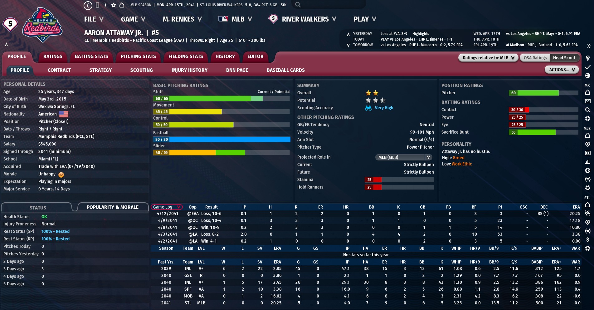 Left-handed starting pitcher Allan Allmon and right-handed reliever Adam Attaway Jr. have both been sent to AAA Memphis while right-handed starting pitcher Juan Farias and right-handed reliever Nick Thiel have been called up from the Redbirds. Allmon, 25, made three starts going 0-3 with a 12.00 ERA. He allowed 16 earned runs in just 12 innings. Attaway Jr., 25, pitched in just two games while with the Walkers. He worked a total of four innings allowing seven hits, nine earned runs and a 20.25 ERA. Farias, 28, spent the entire 2040 season in the St. Louis rotation, going 5-11 with a 3.77 ERA in 26 starts but was demoted to AAA Memphis to start the season after a rough spring training. The righty made one start for the Redbirds, and picked up a win while allowing two runs while pitching a complete game. Thiel, 34, was signed by the Walkers during the offseason after spending the 2040 season pitching in the minors for Chicago. The right-hander appeared in one game for the Walkers, pitching a scoreless inning. For his career, Thiel has pitched in 629 games going 44-35 with 15 saves. He has a career ERA of 4.17. |