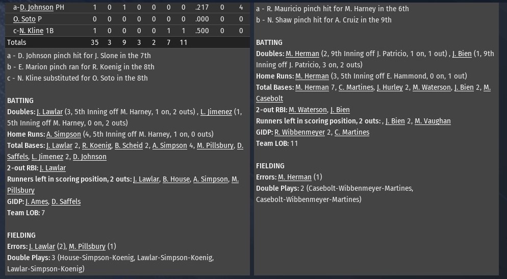 Down 1-0, Savion McMullan connected on a two-run single in the top of the ninth inning to help lift St. Louis to a 2-1 win over Madison at Comiskey Park (1969). Nick Shaw led off the inning with a single off Muskies relief pitcher Mauricio Moreno. Joe Bien pinch-ran for Shaw. Jordan Grullon followed with a single. A walk to Mike Casebolt then loaded the bases. Savion McMullan connected for a single, scoring both Bein and Grullon. Madison's lone run came in similar fashion in the bottom of the first, as it put its first four batters on base against River Walkers starting pitcher Kevin Hrdlicka. However, it resulted in just one run as Kevin Couture Jr. drove in Andy Granado with a bases-loaded single. Hrdlicka settled down after that going six innings, allowing the one run on three hits. He struck out four and walked one. Kyle Smarr, Curt Donaldson and Tom Floria all pitched scoreless innings of relief for the Walkers. Floria posted his second save. Last edited by rink23; 09-15-2022 at 03:31 AM. |