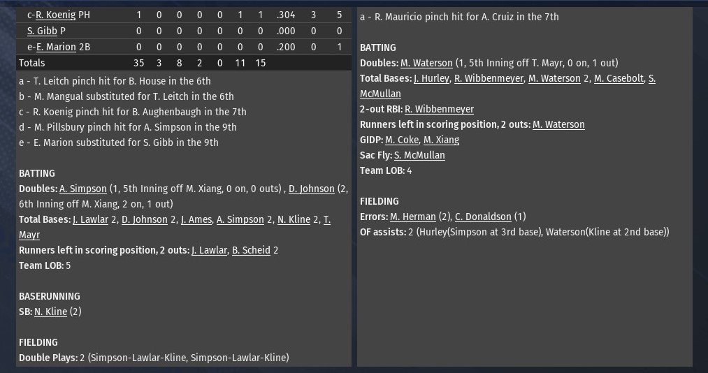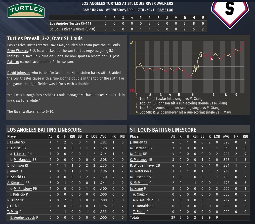 Former St. Louis pitcher Maximilliano Minelli threw five shutout innings and the River Walkers didn't score until the ninth, as Chicago took the opening game of a doubleheader 6-1 at Busch Stadium (2006). Minelli (2-2), who St. Louis traded to Chicago in the 2039, allowed five hits -- three singles, one double and one triple -- during his time on the mound. He struck out seven and didn't walk a batter. Jorge Ariza pitched a scoreless sixth for the G-Men. While another former Walker, Xavier Wigfall, followed that with two more scoreless innings. Willie Acheson handled the ninth and gave up an RBI single to pinch-hitter Josh Hurley, but by that time Chicago led 6-0. It was a rough outing for St. Louis starter Ming Xiang, who allowed five runs on eight hits in five innings. The G-Men scored in four consecutive innings, beginning in the third when Dave Hutchison opened the scoring with a two-out RBI single off Xiang. In the fourth, another former St. Louis player, Chris Gibbs, did some damage with an RBI single. Ryan West followed with a double which plated a run, making it 3-0. Val Moreno doubled off Xiang with one out in the fifth. He scored on a throwing error by Xiang on a ball hit by Ramiro Hernandez. It was one of three error by the Walkers in the game. Josh Rosborough made it 6-0 with his first home run of the season -- a two-run shot off Josh Joyce in the top of the sixth. |