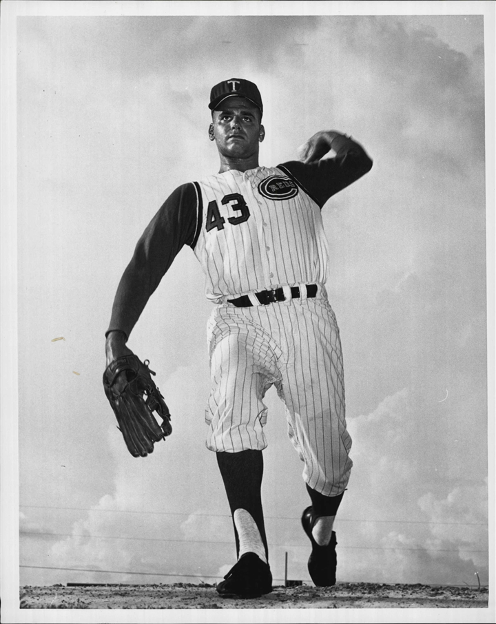A shortstop who led the Big Ten in batting average for part of the 1961 season, James Richard Nelson signed with the Minnesota Twins and played one season in minor league ball with the 1962 Bismarck-Mandan Pards. He is shown here in his Northwestern University uniform.