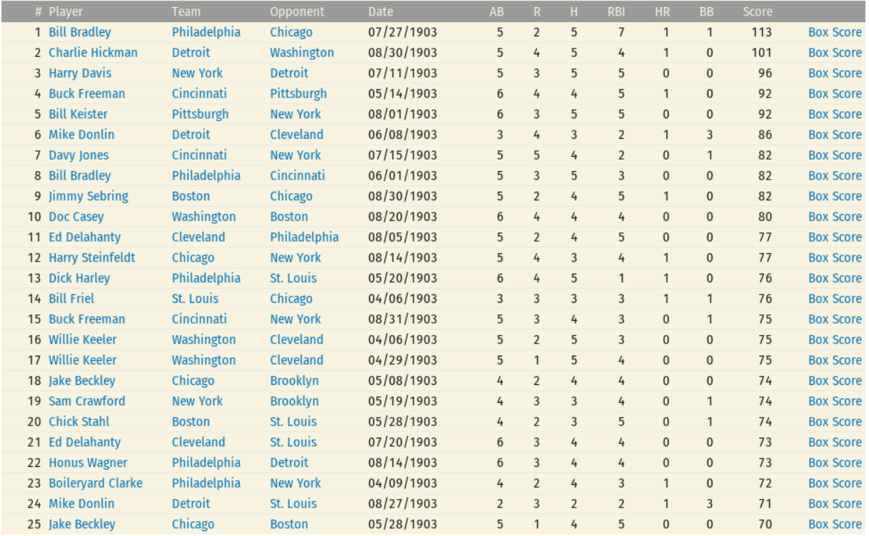 The top batting game performances for the 1903 season. Only 1 Boston American player made the top-25 list (Chick Stahl at #20).