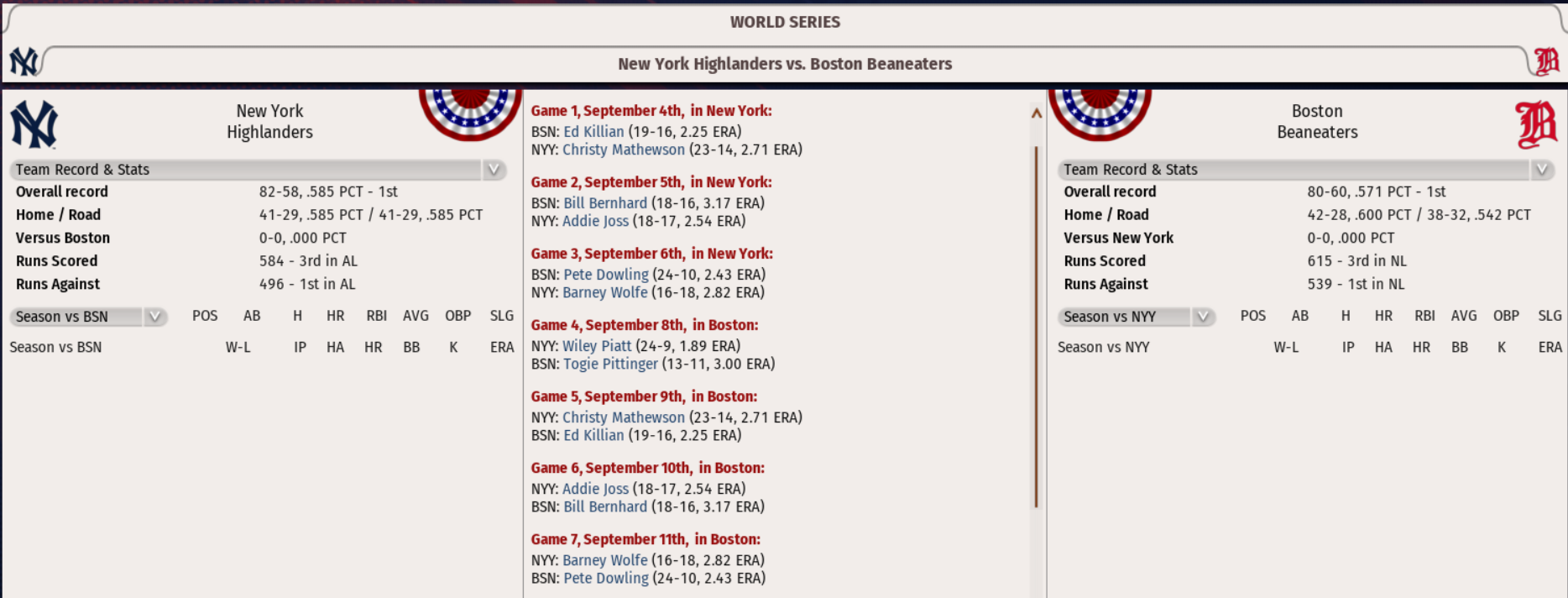 The 1903 World Series is about to begin; pitting the New York Highlanders (82-58) against the Boston Beaneaters (80-60). Following historical rule, this is a best of 9 series.