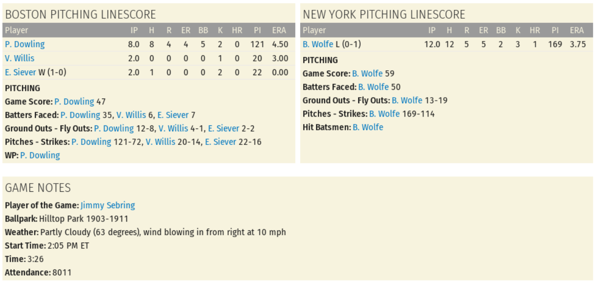 In a multi-pitcher performance, Boston relied on Pete Dowling for the 1st 8 innings in which he allowed 3 earned runs on 6 hits and 2 hit batsmen; Game Score 62. The ball was turned over to Vic Willis for 2 innings of scoreless ball before the handoff to Ed Siever for an additional 2 innings of scoreless effort. Bill Duggleby (1-0) picked up the win for his 1 inning of work. On the otherside of the ledger, Barney Wolfe (0-2) allowed 4 runs (2 earned) in 12 1/3 innings of play in which he allowed 13 hits and 3 walks; Game Score 65. The star hitters on the day for the Beaneaters were Emmet Heidrick (5 for 6, Double, Homerun, Run, RBI, Stolen Base), Willie Clark (2 for 6, Run, RBI), and Jimmy Sebring (1 for 4, Triple, Run, Walk). The Highlanders' offense was generated by Harry Davis (3 for 6, Homerun, Run, 2 RBI), Jimmy Bannon (2 for 4, Double, RBI), and Roy Thomas (2 for 6, Run). Player of the Game: Emmet Heidrick