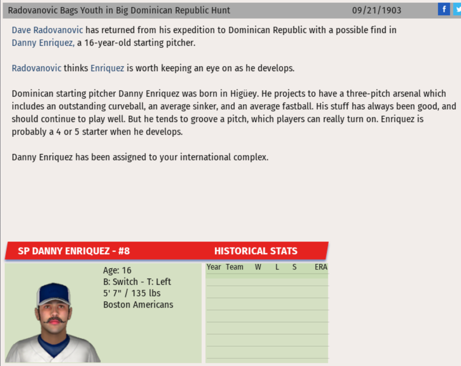 Boston Americans' lead scout Dave Radovanovic reported back with the scouting discovery of 16-year old pitcher Danny Enriquez. While he will be a work in progress and is rather small in stature, maybe Enriquez will be a "diamond in the rough" type of find.