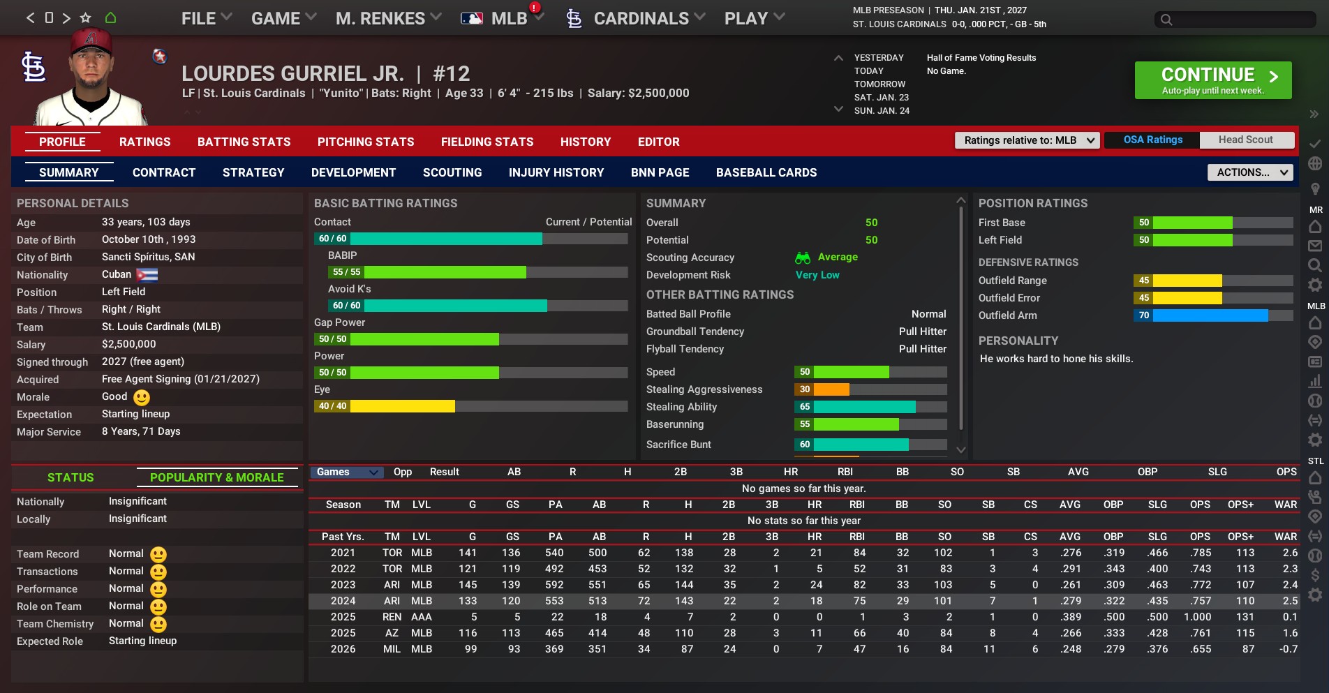 Gurriel Sr., 33, spent the 2026 season with Milwaukee where in 99 games/93 starts he batted .248 with seven home runs and 47 RBIs. He broke into the majors in 2018 with Toronto. And since that time, he has played 961 games/910 starts during which he has hit .274 with 128 home runs and 524 RBIs. |