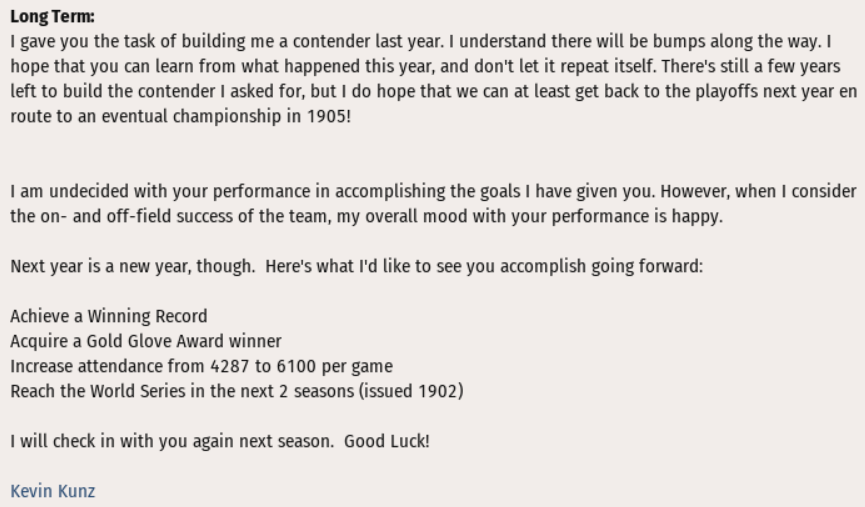 While I really struggled with the idea of trading Young, it is difficult for me to see where the Americans will be competitive in the near term of the 1904 season. If I can draft well and parlay the relief pitchers into a package deal to shore up the starting rotation, perhaps I can make some noise again in the 2 to 4 year range. As shown, my Assistant GM was not happy with what I gave up in the deal.