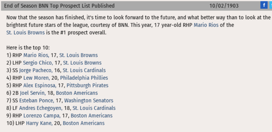 The end of season prospect ranking is out and the St. Louis Browns enjoy the top 2 spots with pitchers Mario Rios and Sergio Chico (both international scouting discoveries). The Boston Americans and St. Louis Cardinals each have multiple players in the top 10.