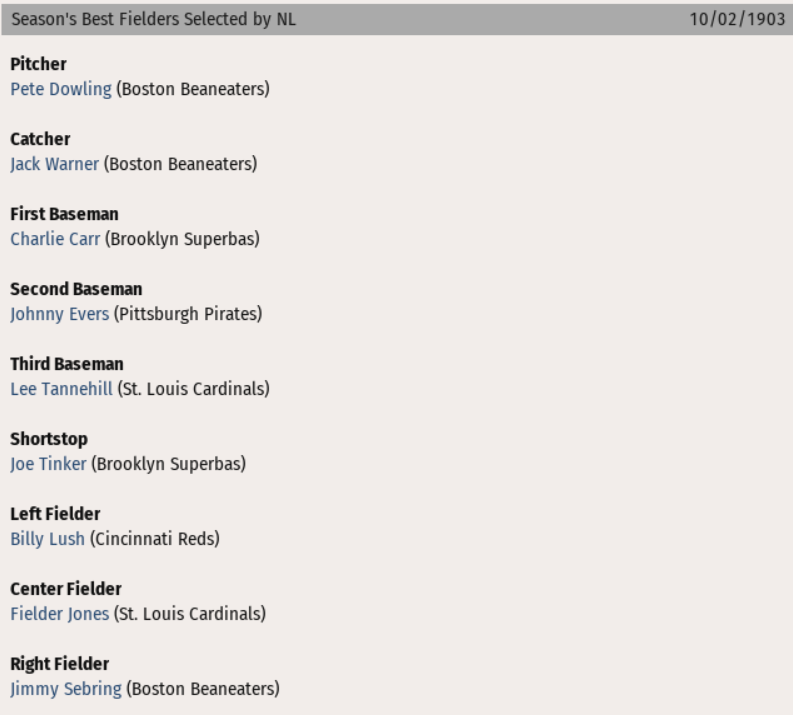 The American League Gold Glove winners were announced today, with the New York Highlanders fielding 4 and the Boston Americans with 3. Of the 9 players, 3 fielders are multi-year recipients of the Award in Lave Cross (1902, 1903), John Farrell (1901, 1902, 1903) and Jimmy Bannon (1901, 1903).