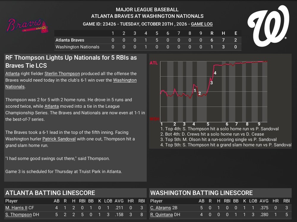 MLB news: Oct. 20 -- NLCS Game 2 - Atlanta 6, Washington 1, Series tied 1-1