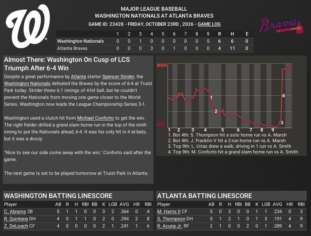 MLB news: Oct. 23 -- NLCS Game 4 -- Washington 6, Atlanta 4, Nationals lead 3-1