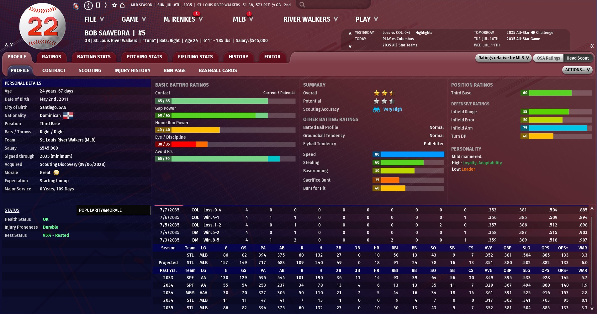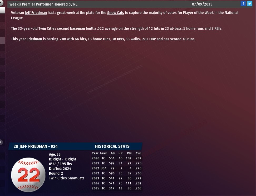 * SP -- Jesse McNaboe -- It's the first All-Star appearance for the 26-year-old right-hander. During 2035, he's gone 9-2 in 18 starts with a 3.19 ERA. * 1B -- Nick Shaw -- The National League's leading vote-getter. The 26-year-old Shaw will be a first-time starter. This season, he is hitting .339 with 16 homers and 61 RBIs in 81 games. * 3B -- Bob Saavedra -- The rookie first baseman has batted .352 with 10 homers and 50 RBIs in 86 games. Last edited by rink23; 09-12-2021 at 05:37 AM. |