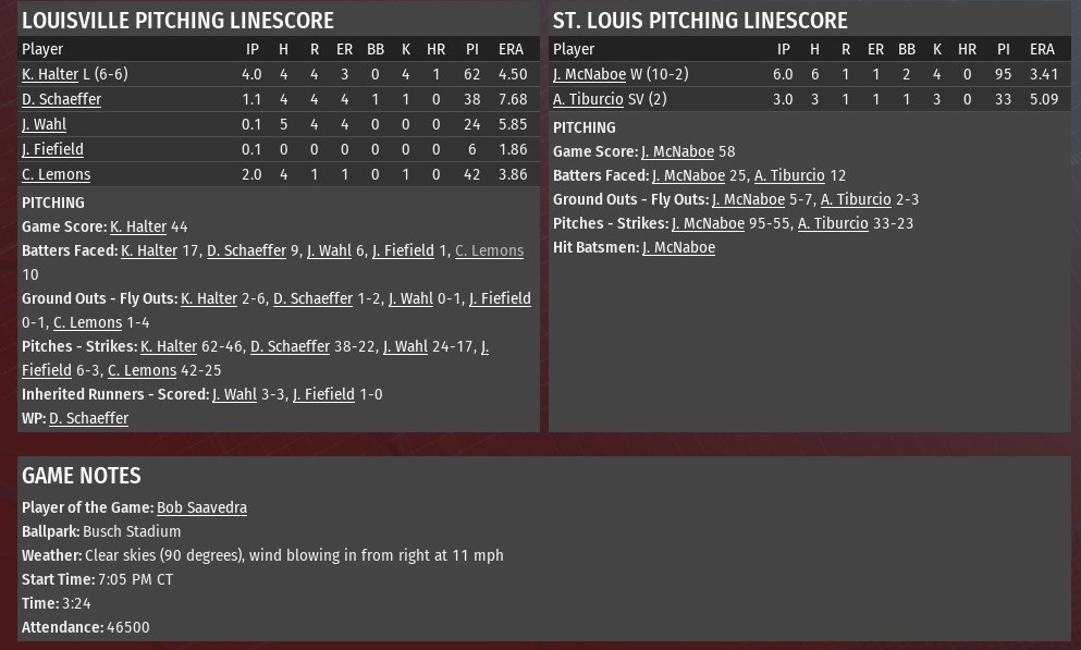 Josh McDonald pitched six shutout innings, and St. Louis took command with three runs in the bottom of the second inning in a game where the River Walkers downed Louisville 4-2 at Busch Stadium (2006). McDonald (8-7) struck out the side in the top of the first inning, and never really got into trouble in his six innings. He allowed three hits, while striking out nine and walked one. McDonald exited the game after a rain delay in the bottom of the sixth. Nick Shaw reached on an error by Sluggers shortstop Alfredo Gomez to lead off the bottom of the second inning. The Walkers put their next three hitters on base against Louisville starter Andres Garcia. Manuel Coke was the fourth to reach base, and he delivered a two-run double to make it 2-0. Jackson Miller made it 3-0 with a sacrifice fly to score Daniel Becerra, who had singled. The Sluggers did get to the Walkers bullpen for a pair of run after McDonald left the game. David Morales hit a solo homer off Zachary Stella in the seventh. The Walkers answered that run with one of their own in the bottom half. Jackson Miller led of with a double off Dave Schaeffer. He scored on an Aaron Nixon fly ball. St. Louis closer Nick Strother could not slam the door allowing three straight base runners after striking out the first two batters he faced. Nick Ruffalo came on with runners at second and third and got Jake Holland to ground out. Ruffalo now has four saves. After Stella pitched the seventh, Scott Rissler set the Sluggers down in order in the eighth. St. Louis second baseman Daniel Becerra had to leave the game after being injured while trying to make a throw. The injury and its extent is still unknown. |