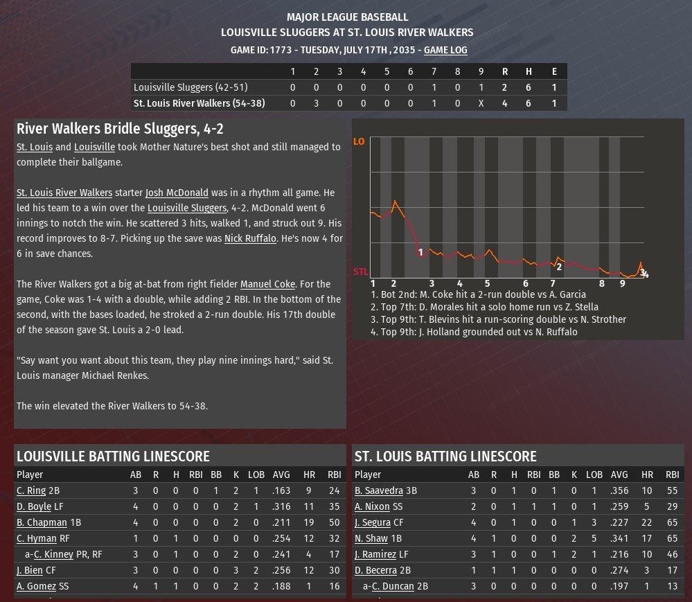 Aaron Nixon capped a 4 for 5 day at the plate with a walk-off home run with two outs in the bottom of the 10th inning, giving St. Louis a 9-8 win over Columbus at Busch Stadium (2006). The River Walkers took three of the four games in their series with the Golden Bears. Columbus reliever Nick Finck struck out the first two St. Louis hitters in the bottom of the 10th. But with an 0-2 count on Nixon, he left one in the zone and he drove it 387 feet over the right-field wall. Nixon drove in four runs in the contest. St. Louis had gone up 8-7 in the bottom of the seventh on an RBI single from Nixon off Bears reliever Jason Johnson. Columbus tied it in the top of the eighth, Mike Wardlaw driving in Javy Gutierrez with a two-out single off Scott Rissler. The Bears had pounded St. Louis starter, and 2035 All-Star, Jesse McNaboe for six runs in the top of the second inning. Neil Assenjberg did the bulk of the damage with a grand slam. The Walkers put together seven runs in the fifth against Bears starter Cesar and a couple of relievers. Bob Saavedra had a two-run double during the outburst, while Nixon plated a pair with a single. McNaboe had the one bad inning, but it was ugly, as in five innings overall he gave up six runs on eight hits. He did strike out eight while walking two. Juan Munox (0.1 IP) and Zachary Stella (0.2) combined to pitch the seventh for St. Louis. After that, it was an inning apiece for Nick Ruffalo, Scott Rissler and Nick Strother. Strother (3-2) came out of it with the win. Last edited by rink23; 09-12-2021 at 06:22 AM. |