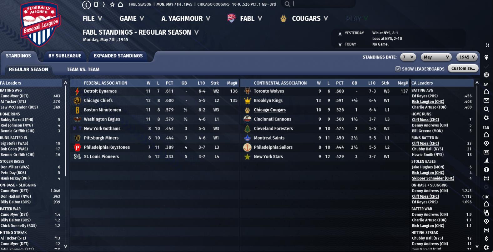 Weekly Record: 6-1 Seasonal Record: 10-9 (2nd, 1 GB) Stars of the Week Cliff Moss : 26 AB, 10 H, 3 HR, 11 RBI, .385 AVG, 1.368 OPS Billy Riley : 2 Wins, 17.0 IP, 3 BB, 7 K, 1.06 ERA Rich Langton : 25 AB, 9 H, 1 HR, 3 RBI, .360 AVG, .993 OPS Schedule 5-1: Win vs Kings (1-5) 5-2: Win vs Kings (2-3) 5-3: Win vs Kings (2-5) 5-4: Win at Stars (7-1) 5-5: Win at Stars (6-2) 5-6: Win at Stars (8-2) 5-6: Loss at Stars (2-10) Recap No Saints, no problem! In a complete reversal of fortune, the Cougars ran off six straight before losing the second game of a double header, jumping from dead last to second and just a single game out of first. The CA is a jumble after three weeks, with 5 teams winning 9 or more games and the Sailors (8) are the only team below that mark. No team is more then three games out of first, as the 9-6 Toronto Wolves lead the 13-9 Kings on win percentage while reversed in games back. We've given the Kings five of their losses and have now won more games then the Saints, who have only one three other wins. A lot of this is due to the one-man wrecking crew known as Cliff Moss, who was named Player of the Week in his third Player of the Week worthy week. Moss went 10-for-26 with 2 triples, 3 homers, 5 walks, 5 runs, and 11 RBIs. The 38-year-old vet now paces all CA hitters with 7 homers and 23 RBIs to go with an astronomical .324/.395/.718 (204 OPS+) triple slash in 19 games. One of the few planned starters surviving the war, Moss is coming off an excellent season where he hit .281 with 19 homers, 63 RBIs, and a 148 WRC+. If we want to stay above .500 we'll need some more thunder from his bat, as he's been directly responsible from an impressive 35% of our runs scored. And while the help behind him is minimal, it would be unfair to say he's doing it all by himself. Moss has a capable sidekick in Rich Langton, who has been well above average all season. Langton went 9-for-25 with a triple, homer, two steals, five runs, four walks, and three RBIs. The 33-year-old trails just fellow Cougar draftee Ed Reyes (.456) in batting average, hitting .408/.447/.500 (162 OPS+) with 2 doubles, a triple, homer, 4 steals, and 8 RBIs. No other batter with more then 50 PAs has both an above average OPS+ and WRC+, so we might have to alter the lineup a bit. The first step is more time for Don Lee, who had a big 5-for-15 week with a double, homer, 4 runs, and 4 RBIs. Lee is four shy of 50, but has hit an impressive .306/.444/.528 (168 OPS+). Orlin Yates is the far superior defender, so when guys like Harry Parker and Billy Riley in, Yates is a must, but with ground ballers the ball won't be hit to center as often. Yates had his first good week, as while he went just 3-for-15, he hit a pair of homers to increase his season line to a still puny .143/.217/.310 (45 OPS+). A few of the vets produced too, starting with leadoff man Dick Walker. Walker went 6-for-25 with a double, homer, 2 RBIs, 4 walks, and 5 runs scored. Harry Mead went a similar 5-for-18 with a triple, 2 runs, and 2 walks. Walker and Mead now have almost matching WRC+ of 93 and 92, so this is definitely a stretch in the write direction. At 38, I'm not sure how much better Walker can hit, but Mead has produced a WRC+ above 140 in two of the last last three seasons. There's plenty of room for improvement from our talented catcher, but he does like to alternate above and below average seasons at the plate. There's a reason we rank seventh in runs, but I think we'll finish up middle of the pack. We allowed only 13 earned runs in seven games, and seven of them were charged to a 44-year-old. Dick Lyons made the emergency start in the double header, and last just 3.2 innings. The Stars piled on 8 hits, 7 runs, and 2 walks with a strikeout, ending a stretch of four consecutive scoreless outings. He'll move back to the pen, and likely stay there, as we may have found a reliable enough fourth starter. That would be Rusty Petrick, who was a Skipper Schneider error away from a complete game shutout. In his first start of the season, he allowed just 6 hits, 2 walks, and the unearned run with 6 strikeouts. He's now allowed just one earned run in 21 innings, and his 0.43 ERA is nearly a point and a half lower then the second best Win Lewis at 1.83. The true star of the week might have been Art White, who saved the pen with a pair of complete game victories. He outdueled his former team in Brooklyn, allowing 9 hits, 2 runs, and a walk in a 3-2 win. He then improved his record to that mark, allowing 8 hits, a run, and 4 walks with a pair of strikeouts in game one of our first double header of the season. White started out great last season, winning his first ten decisions, and once again his ERA (2.83) is far lower then his FIP (4.42). He's going to get a lot of starts for us this season, so we're hoping he doesn't have a second half slump once again. Same can be said for Billy Riley, who has not looked like the pitcher who finished 1944 with us. He picked up a second win against the Kings, allowing 5 hits, 2 walks, and an unearned run while striking our 3 in 8 solid innings. He then dominated the Stars and Dyckman stadium, picking up a complete game win with just 5 hits, 2 runs, a walk, and 4 strikeouts. He's an impressive 3-1 with a 2.97 ERA (132 ERA+) and 1.07 in his first five starts. Riley may have a Wilcox like adjustment, as he struggled post trade but settled down after his first Spring as a Cougar. While there are fears White and Riley might not keep things up, I'll never worry about Harry Parker. Gone are the automatic complete games, but he finds ways to win games and has kept homers under control. He wasn't his normal self against the Kings, but he held them to just two runs on a walk and nine hits. Parker has yet to get past the 7th, topping out at 107 pitches. I may have to skip some starts for him to give him extra rest, but I'm not sure that would help much. The talent is still there, but I'm starting to entertain the idea of converting hi