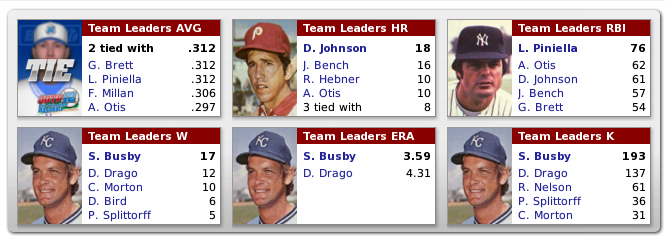 The Royals might be beginning to take shape, injuries have healed and the team is starting to take better shape C-Bench (duh) 1B-Davey Johnson, or Bob Oliver 2B- Felix Millan SS-Frank White 3B-George Brett LF-Pat Kelly CF-Amos Otis, or Bob Oliver, or Tommie Agee waiver from MIL, b/c of oft injured Amos Otis RF-Al Cowens, or Joe Keough Steve Busby Dick Drago Dennis Leonard Al Fitzmorris Carl Morton also getting some starts Mike Torrez claimed off waivers from Tex and Joe Niekro developing for long relief/starters/trade bait Splittorff and Gura are waiting in AAA |