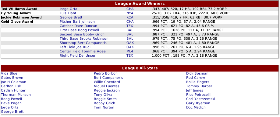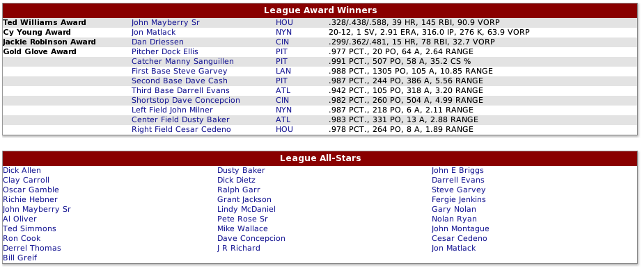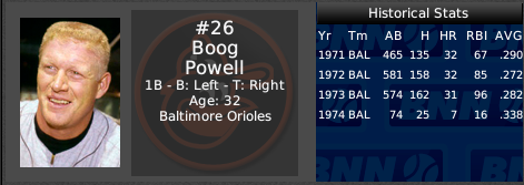 How did the Royals solve the 1B issue? I was going to point out that the flip-side of not having Mayberry is that you are going to be pretty steady and productive behind the dish for several years (assuming Bench is kept), and that you might be able to solve - for the short-term - the 1B issue by shifting Davey Johnson there and putting Frank White in as the everyday secondbaseman a little earlier that happened in real life... Just a thought.